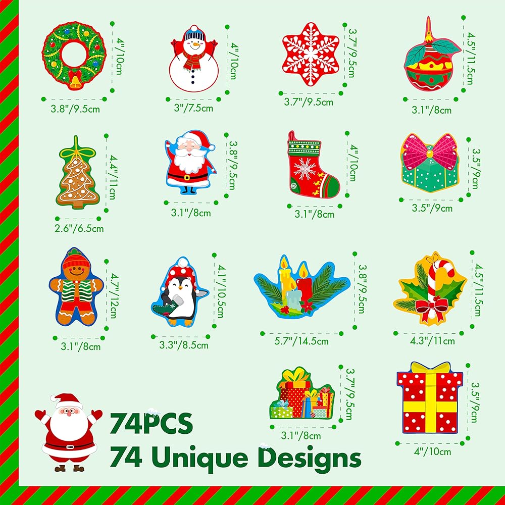 عبوة قيمة: تأتي مجموعة الديكور مع 74 قطعة من قطع عيد الميلاد بتصميمات متنوعة، وكمية كافية لتلبية احتياجات الديكور. توفر الزخارف الملونة والملفتة للنظر المزيد من الطاقة وتخلق جوًا قويًا لعطلة عيد الميلاد. أضف المزيد من المرح إلى حفلتك أو لوحة الإعلانات، وهي زينة ممتازة للعطلات من اختيارك.
