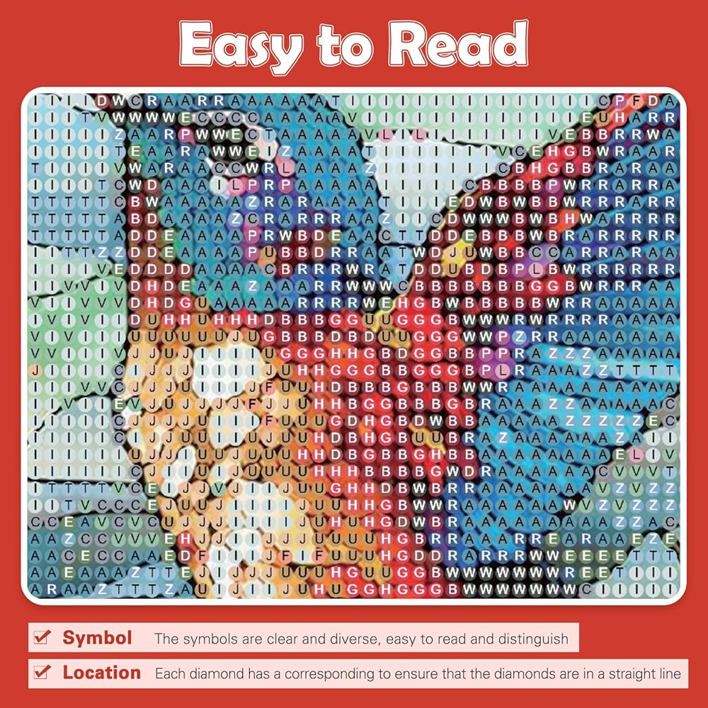رموز سهلة القراءة - من أجل جعل عملية جعل اللوحة الفنية الماسية أكثر إثارة للاهتمام وسهولة، نستخدم رموزًا ورسومات مختلفة لتمييز مناطق الألوان المختلفة، والقماش السميك، ومناطق الرسم الأكبر، لذلك يسهل على البالغين والمبتدئين فهمها. ابدأ