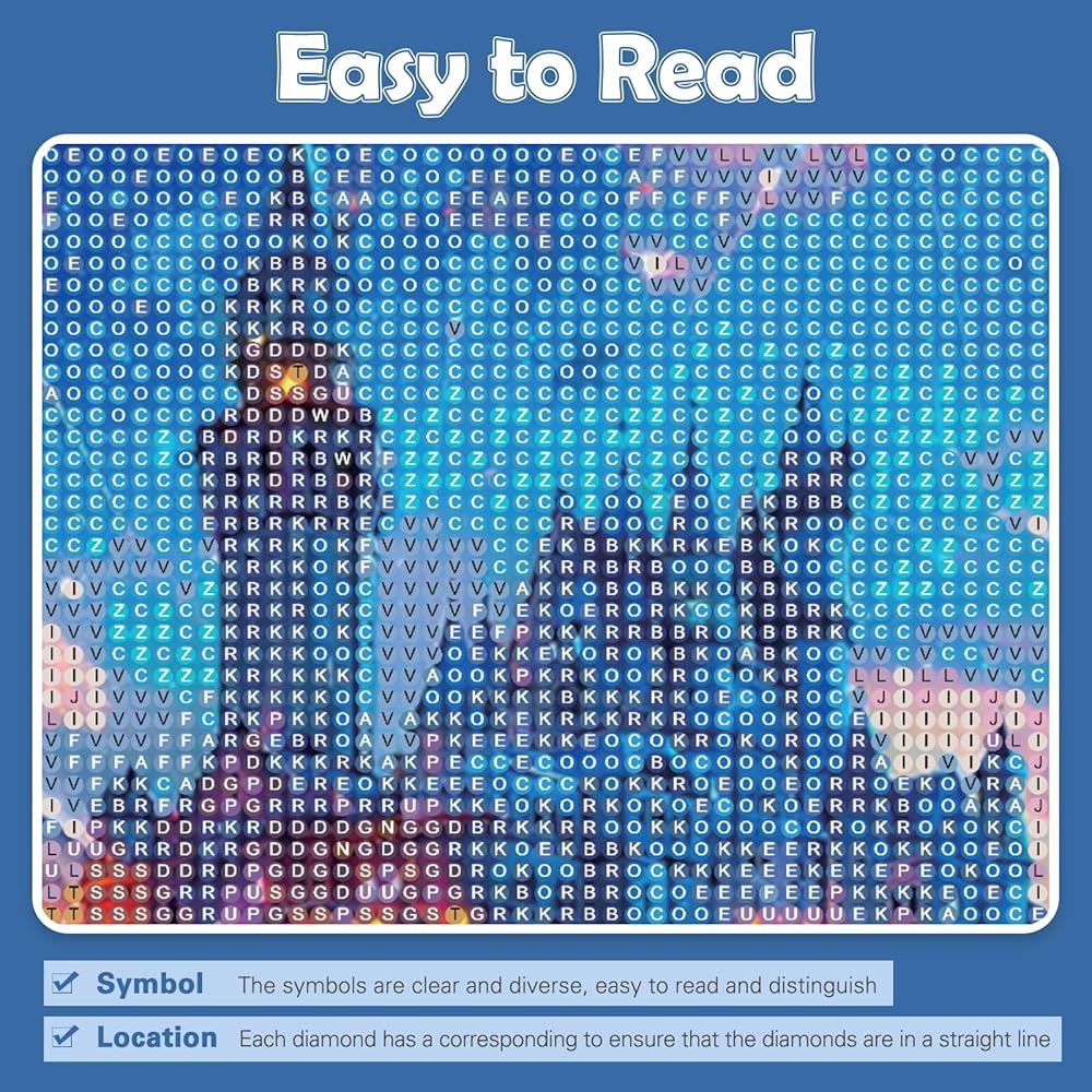 رموز سهلة القراءة - من أجل جعل عملية جعل اللوحة الفنية الماسية أكثر إثارة للاهتمام وسهولة، نستخدم رموزًا ورسومات مختلفة لتمييز مناطق الألوان المختلفة، والقماش السميك، ومناطق الرسم الأكبر، لذلك يسهل على البالغين والمبتدئين فهمها. ابدأ