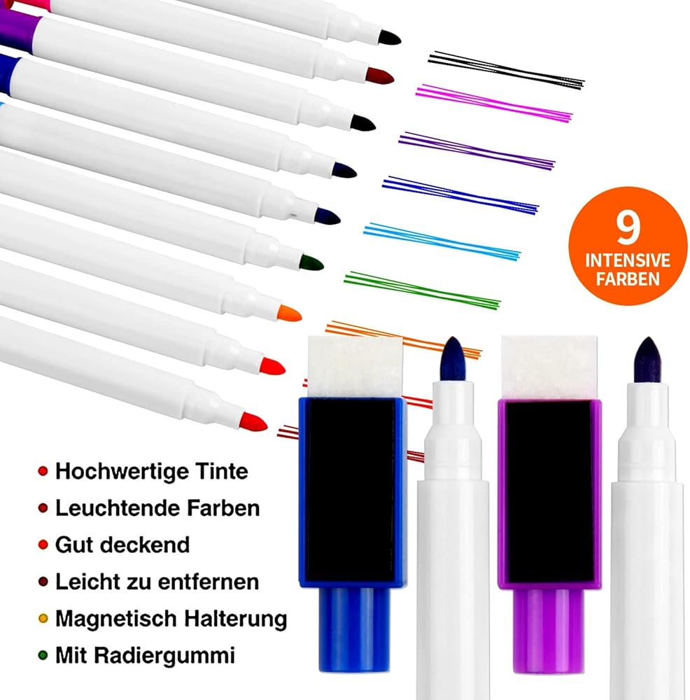 Color: Markers of 9 colors, including Red, Yellow, Purple, Green, Black, Pink, Dark Blue, Light Blue, Orange