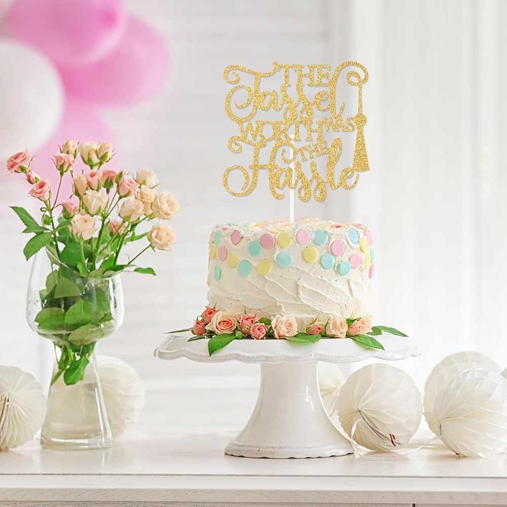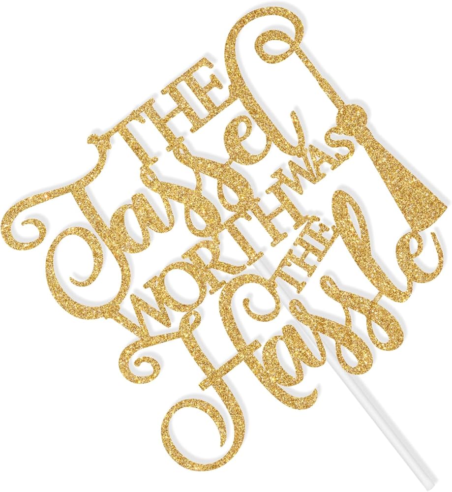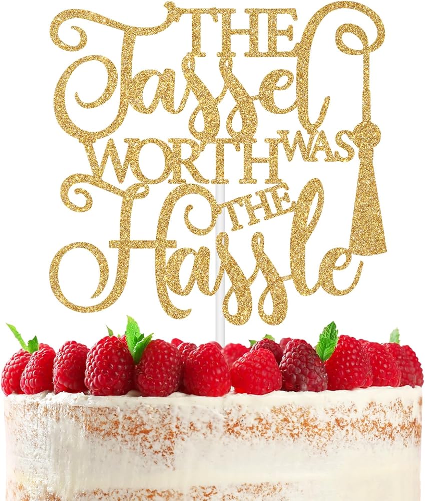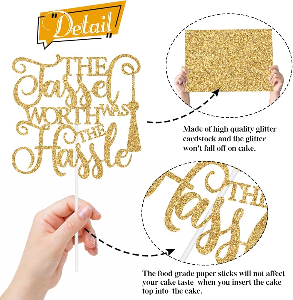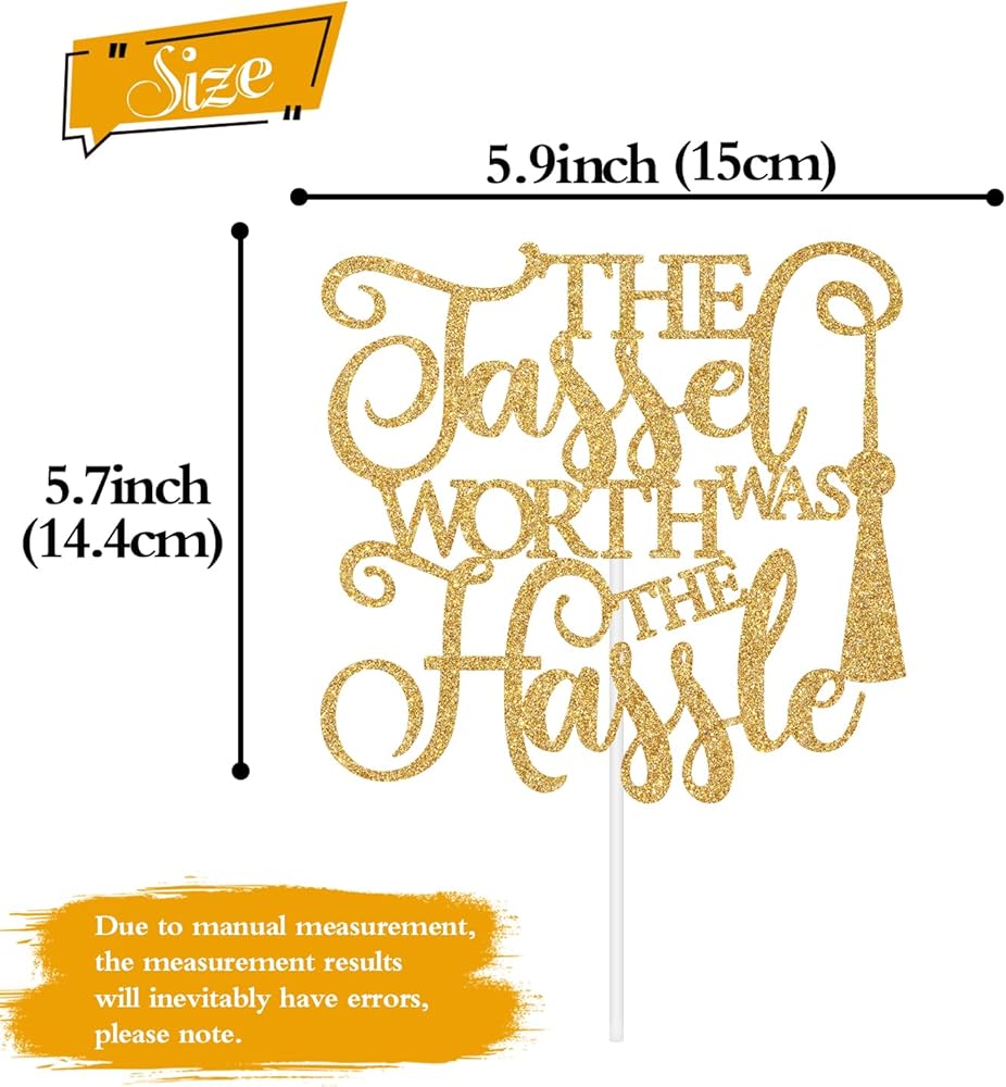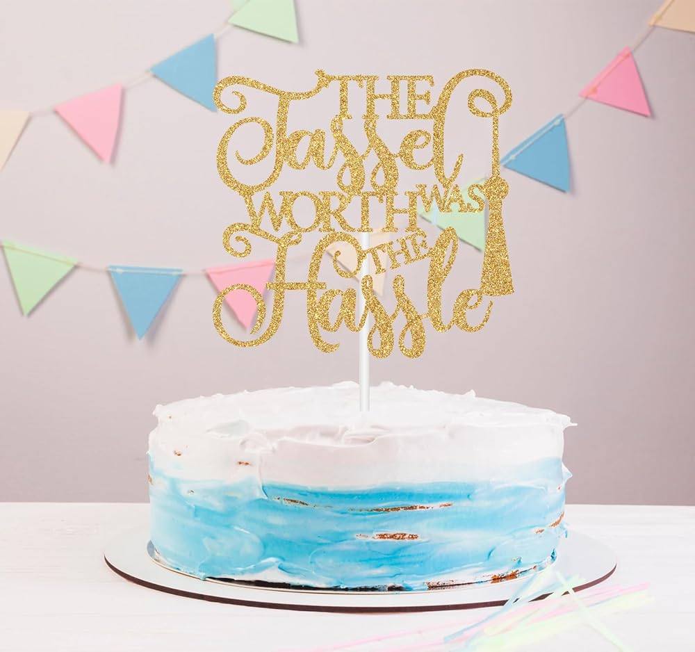 Package Contents: 1 gold glitter 'The Tassel was Worth the Hassle' cake topper, protected in sturdy cardboard packaging