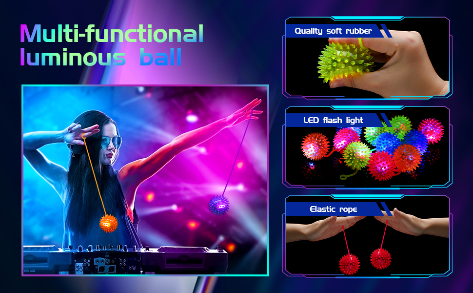 أغراض متعددة: هذه الكرات الوامضة مناسبة جدًا لأنواع مختلفة من الألعاب، مثل البيسبول والشعوذة وألعاب الارتداد وغيرها من الألعاب الليلية، ويمكن أيضًا استخدامها لتدليك القدم أو مضغ الحيوانات الأليفة أو المراهقين أو البالغين لتخفيف التوتر.