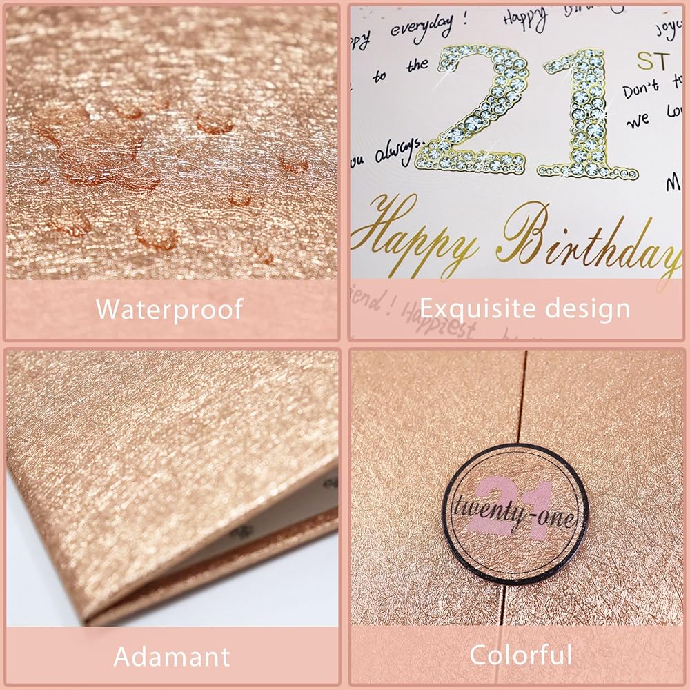 【تصميم رائع】- تحتوي الشهادة الذهبية الوردية على شارة مذهبة على الغلاف، والجزء الداخلي من شهادة التوقيع مقسم إلى ثلاثة أجزاء، والصفحة الوسطى مطبوعة برسالة "عيد ميلاد سعيد 21". يمكن فتح لوحة توقيع عيد الميلاد الحادي والعشرين هذه المصنوعة من الذهب الوردي مباشرةً ووضعها على الطاولة. نصائح: لا يوجد قلم.