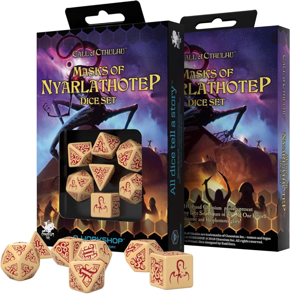 In fables, the seventh son of the seventh son usually has great power and the ability to overcome all obstacles. He is born to be the hero and victorious in all struggles. Q WORKSHOP created a set of seven dice suited for all seven editions of the great game Call of Cthulhu from Chaosium, one of the oldest publishers of role-playing games still in existence. The Seventh Edition is the newest and most polished incarnation of this famous game. Behold the Call of Cthulhu Beige & black Dice Set (7). Believe me or not, but sympathetic magic works. Seven is magic. So are our dice.They are the quintessence of what is most characteristic in the Call of Cthulhu - the class and horror, so different from other games, where the fight is in the first place.
