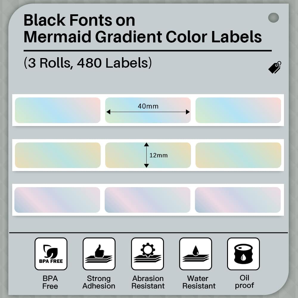 ملصقات D30 - ملصقات حرارية ذات ألوان متدرجة على شكل حورية البحر، ملصقات ذاتية اللصق للأعمال المنزلية والمكاتب، متوافقة مع صانع الملصقات Memoking/Phomemo D30، 12x40 مم/0.47x1.57 بوصة، 3 بكرات