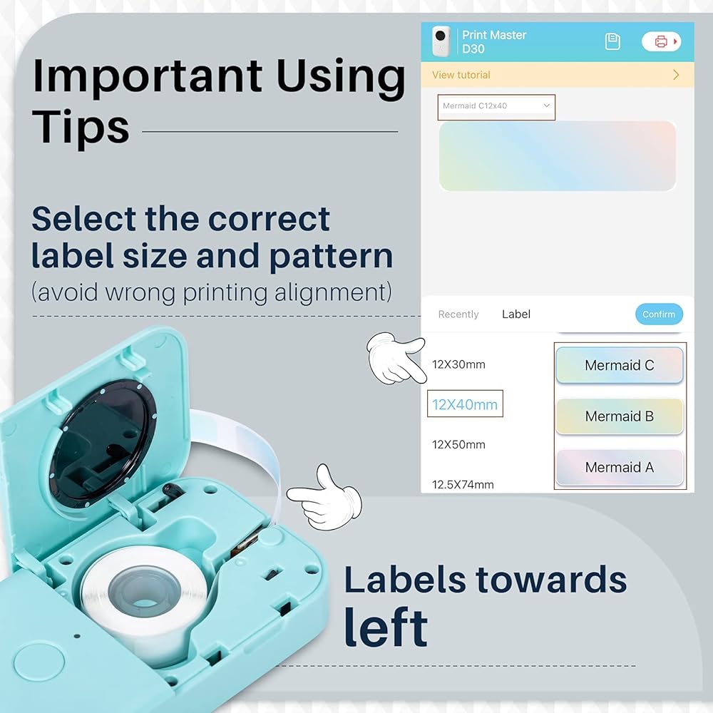 • المشكلات وميزة الالتزام القوي: هام: يرجى تحديد حجم الملصق الصحيح في تطبيق "Print Master" أثناء الاستخدام لتجنب مشكلات تخطي الورق والمحاذاة. متوافق مع صانع الملصقات D30. يتميز ورق الملصق هذا بقدرة التصاق قوية على سطح اللصق، ولا داعي للقلق بشأن اعوجاج الحواف وتساقطها