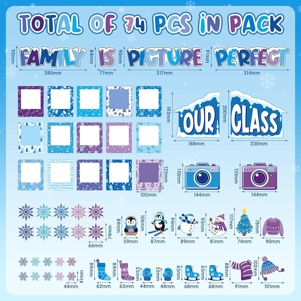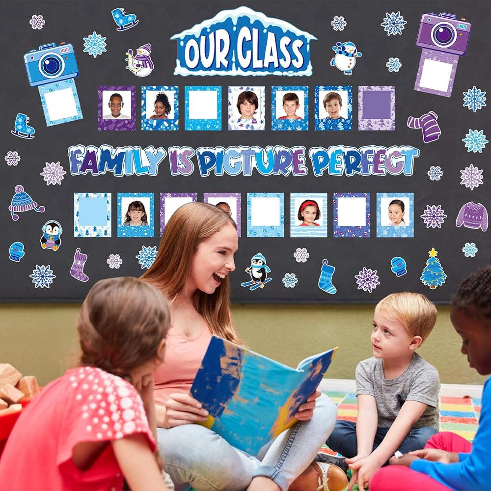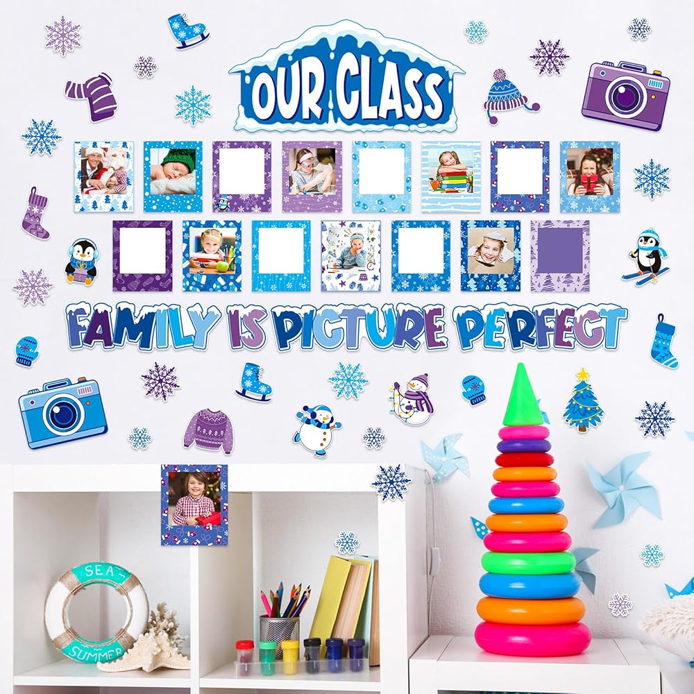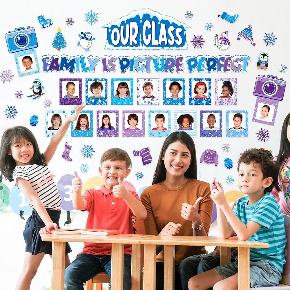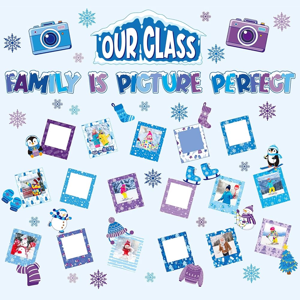 • this winter school bulletin board decorations set has 30 pcs blank winter picture frame cutouts where you can display precious memories, with a "Our Class Family Is Picture Perfect" quotes, our winter Christmas bulletin board decorations preschool are made of laminated card stock, good for kingergarten, pre-k, preschool, school, office, home