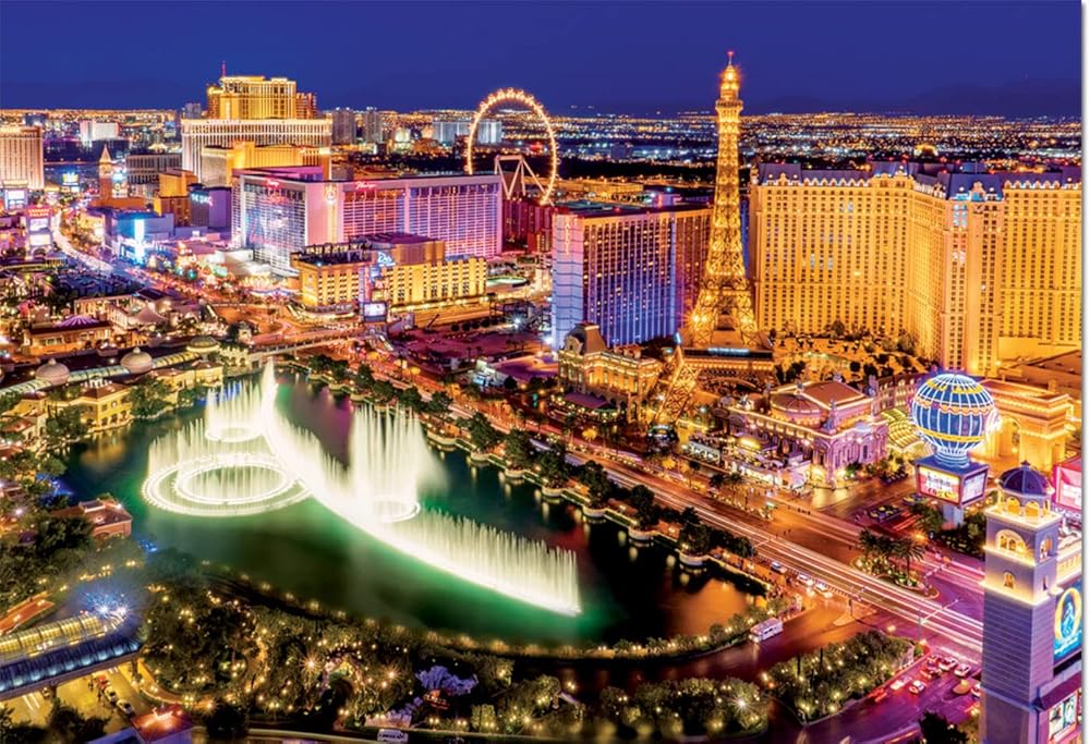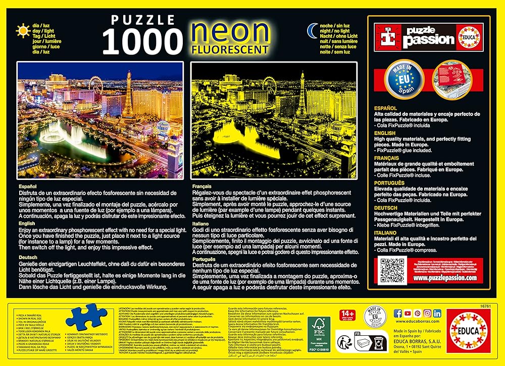 1000 neon piece puzzles Vegas at night, a fluorescent puzzle that glow in the dark. Approximate size of the assembled puzzle: 68 x 48 cm.00.