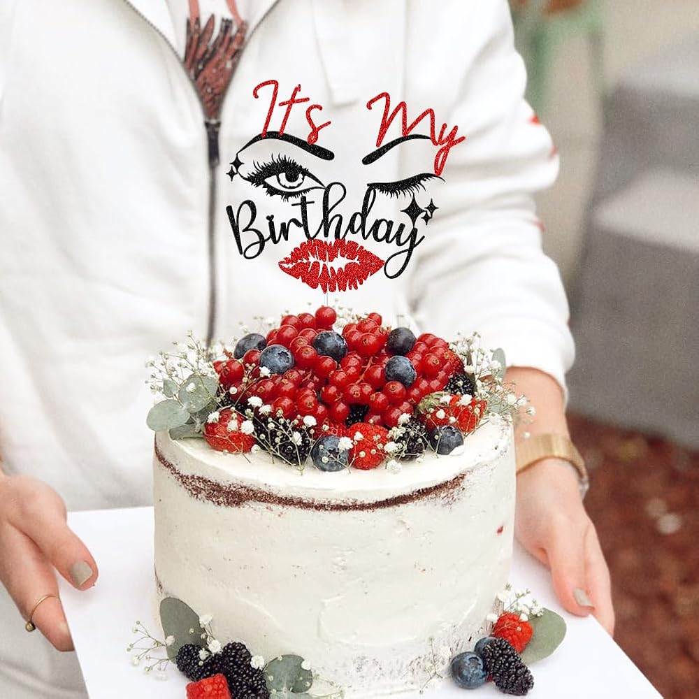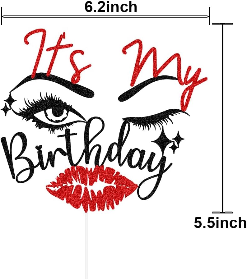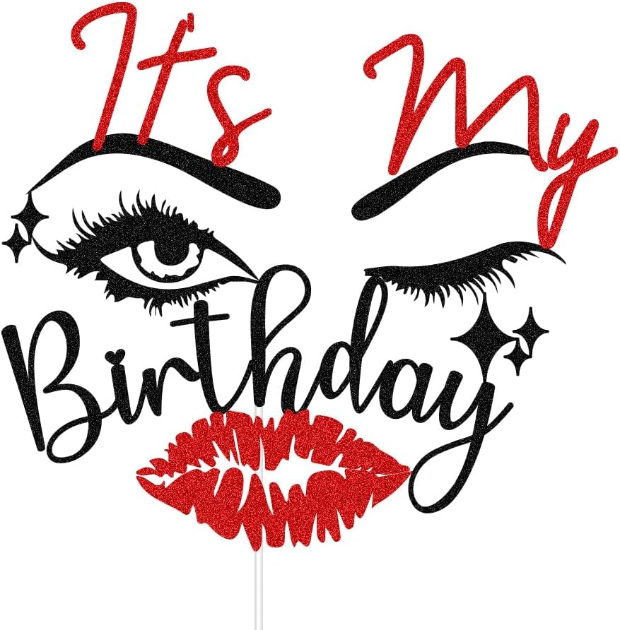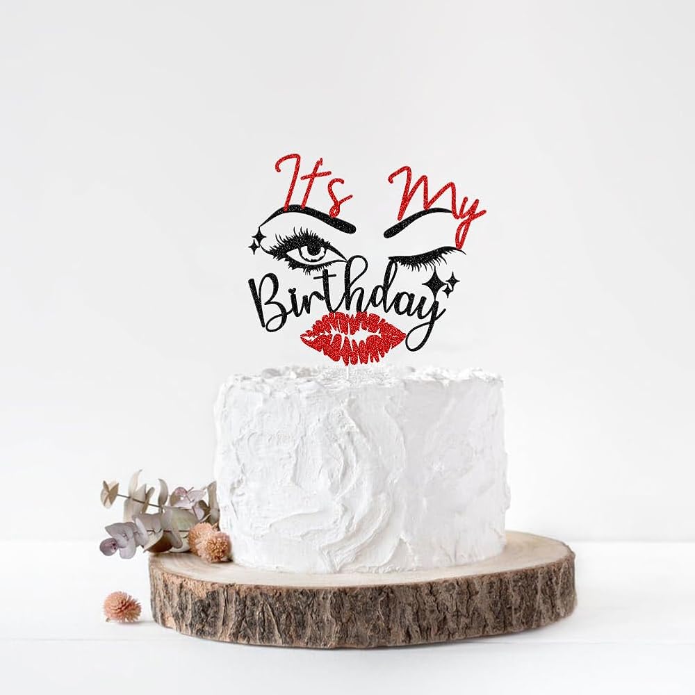 إنها زينة كعكة عيد ميلادي المضحكة لتزيين حفلات أعياد الميلاد للفتيات والنساء وعين أحمر الشفاه وديكور كعكة عيد ميلاد سعيد باللون الأسود والأحمر اللامع