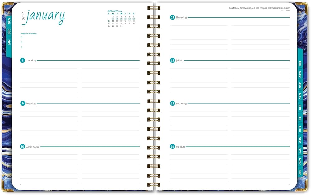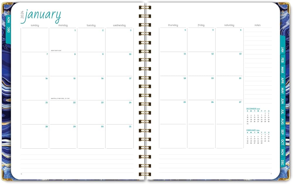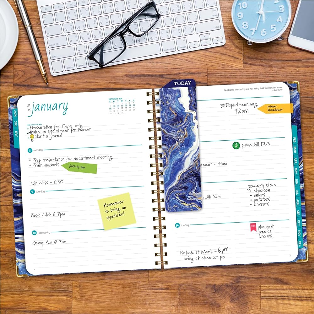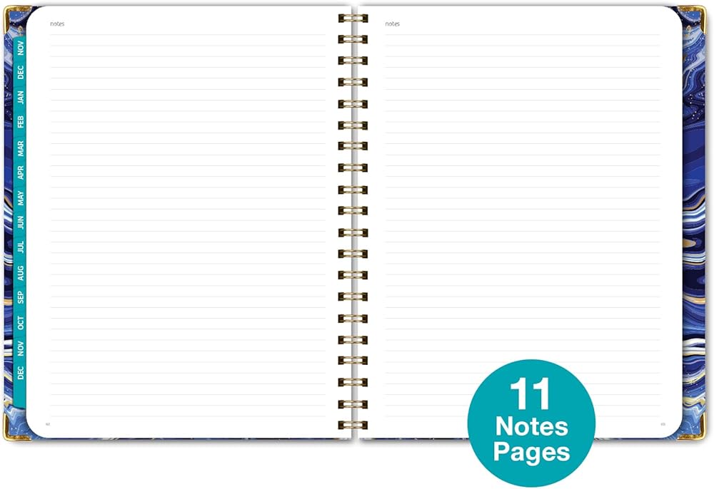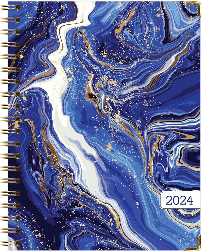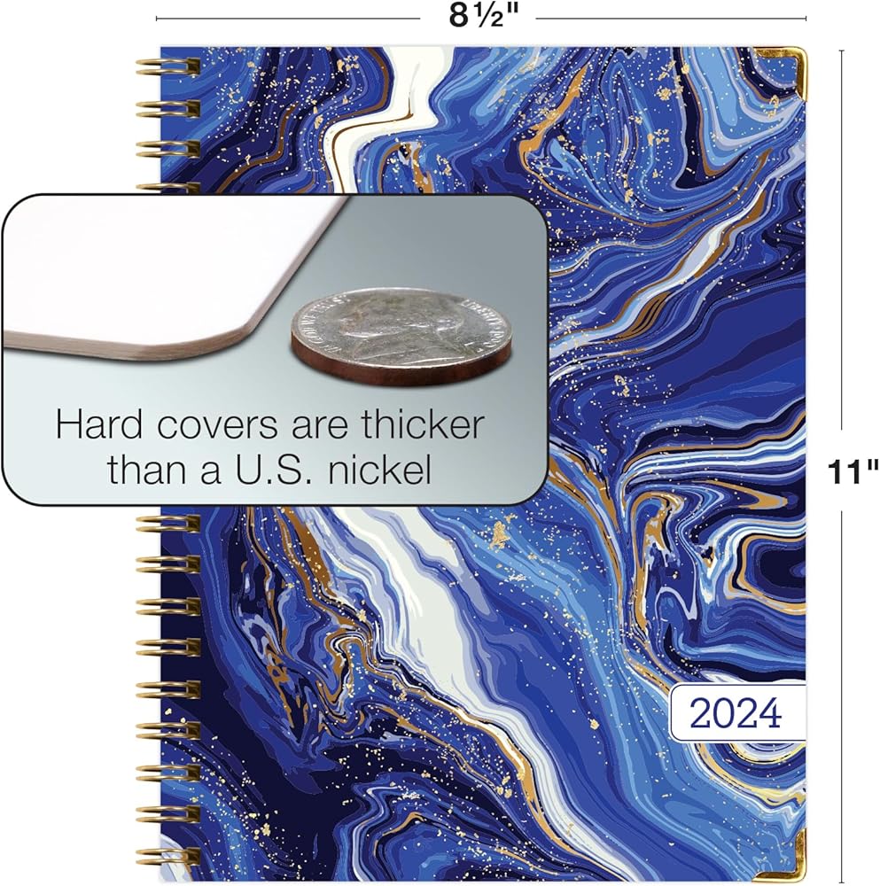 مخطط غلاف فني 2024: (نوفمبر 2023 حتى ديسمبر 2024) 8.5 بوصة × 11 بوصة مخطط يومي أسبوعي شهري وجدول أعمال سنوي. مجموعة الإشارة المرجعية ومجلد الجيب والملاحظات اللاصقة (رخام أبيض أزرق)