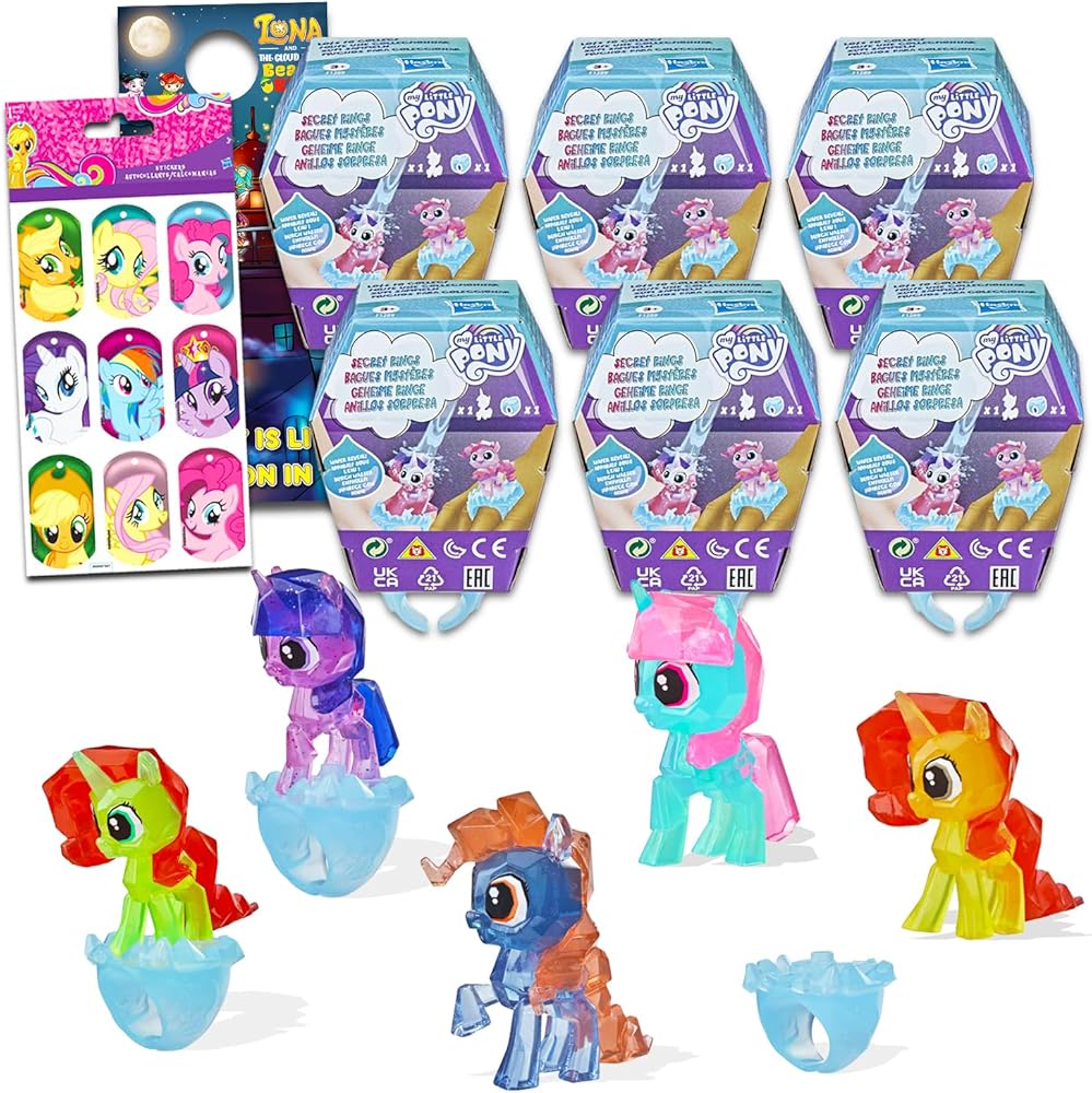 Decade West Exclusive My Little Pony Party Favors for Kids - Bundle with 6 My Little Pony Color Reveal Ring Blind Bags Plus Stickers, More | My Little Pony Birthday Party Supplies for Girls. This My Little Pony party favors set includes 6 My Little Pony blind bags, each including one color reveal ring and mini figurine. Run your My Little Pony ring and figure under water to reveal the color of your My Little Pony character! Fans of all ages are sure to love revealing which My Little Pony character they received. Perfect for all My Little Pony fans, these blind bags are great to use as party favors, party supplies, goodie bag fillers, and more. Officially licensed My Little Pony color reveal ring set is perfect for fans of all ages, boys and girls alike. Set also includes bonus My Little Pony stickers and a Luna and the Cloud Elves door hanger.