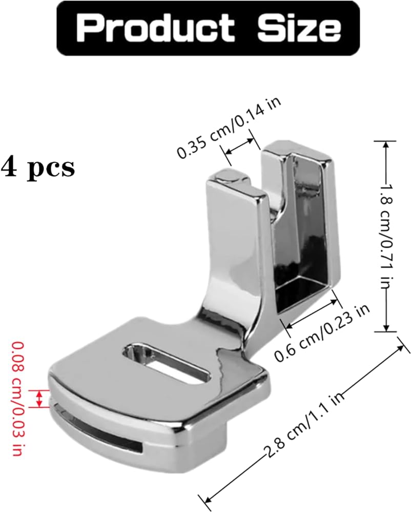 Packaging Delights: Your package gracefully contains an elegant set of 4 precision presser feet, each measuring a compact 2.8 x 1.8 cm (approximately 1.1 x 0.7 inches), tailored for precision and convenience