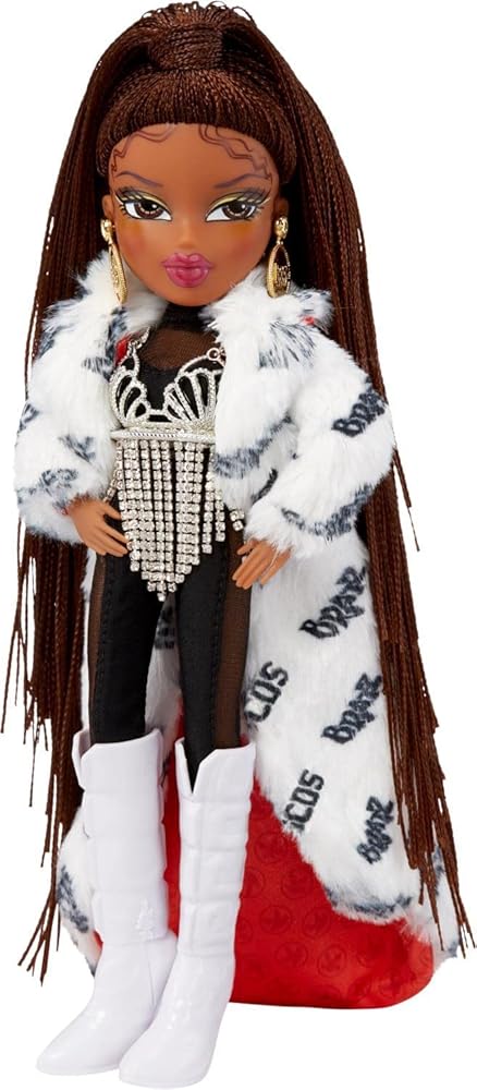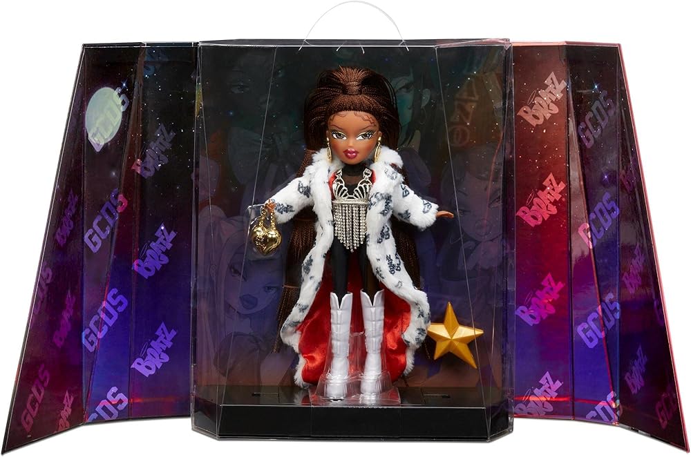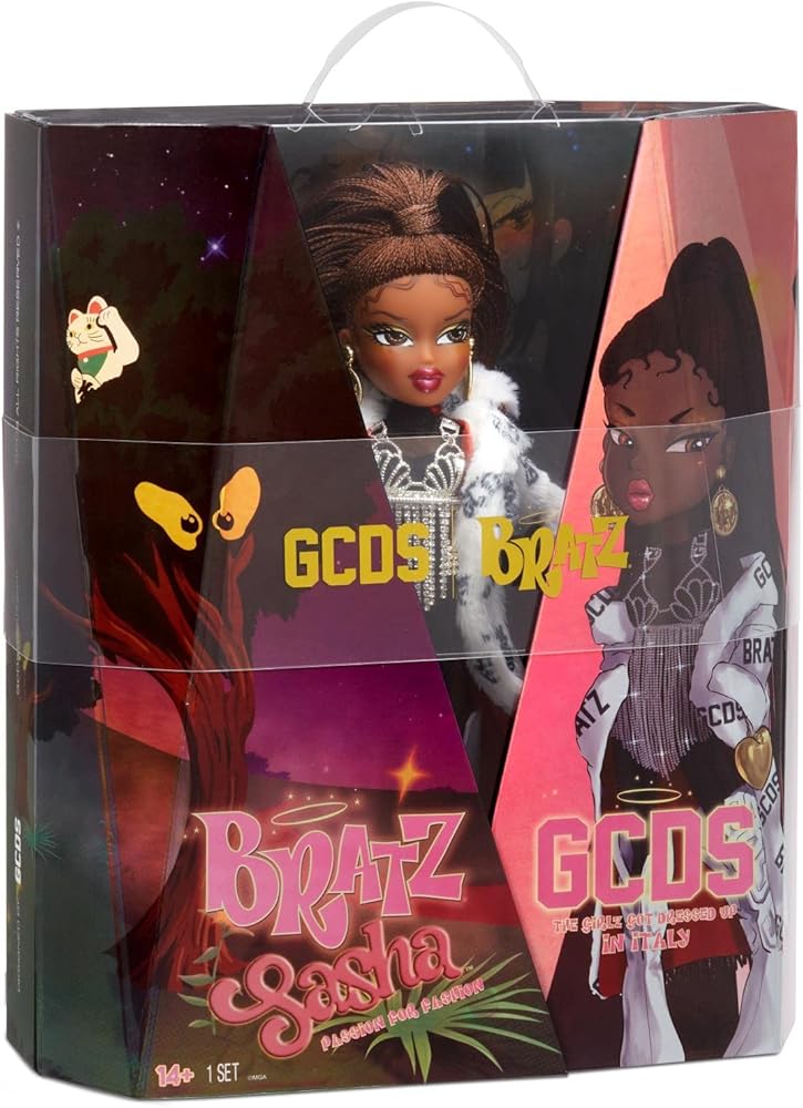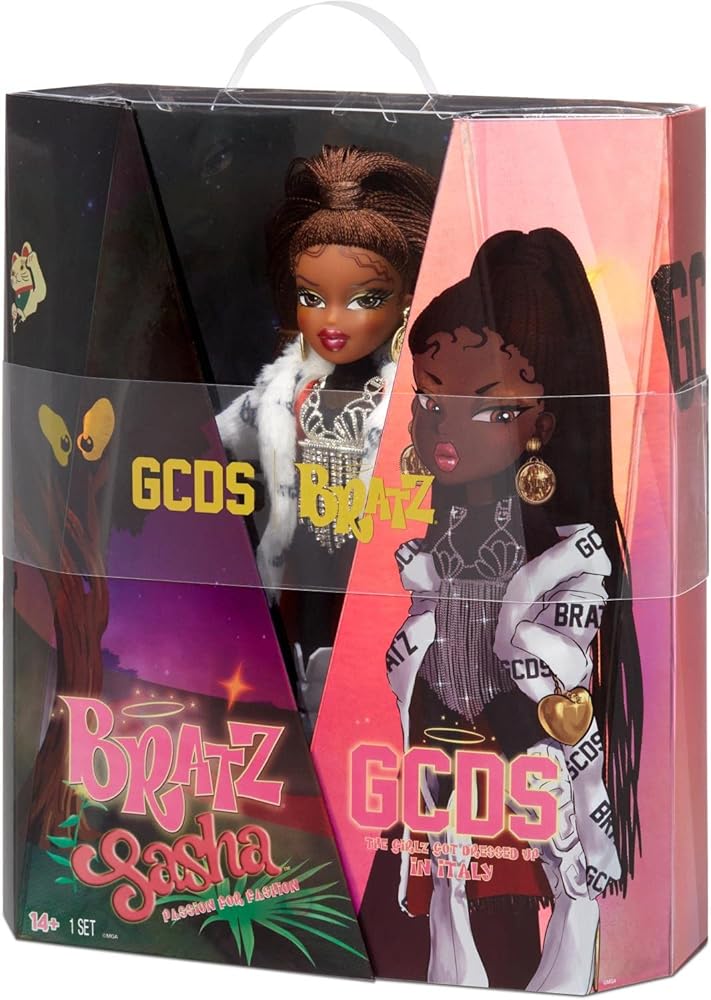 Bratz has teamed up with world renowned Italian streetwear brand GCDS to create this special edition Sasha doll. Collectors and new Bratz fans can collect this all new, premium, and limited edition fashion doll. Sasha wears a black bodysuit with mesh panels, crystal embellished Shell sparkle dress, faux fur coat with GCDS & Bratz print, and GCDS Establish white boots. She also comes with a metallic gold Heart bag, and gold Bratz earrings. Sasha has a fully articulated body and comes with a stand to display her on— use the full stand from the base of the box or opt for the smaller stand by removing it from the larger base. The premium box has a foil finish and graphics featuring iconic elements from GCDS fashion shows. When the flaps of the package are opened, an all-over foil Bratz print is revealed on the interior. Collect both Yasmin & Sasha from the Bratz x GCDS Designer collection: the girlz got dressed in Italy styled by Giuliano Calza in his favorite looks.