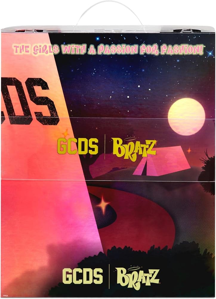 PREMIUM PACKAGE: The geometric trapezoid box has a foil finish and graphics featuring iconic elements from GCDS fashion shows. When the flaps of the package are opened, an all-over foil Bratz print is revealed on the interior.