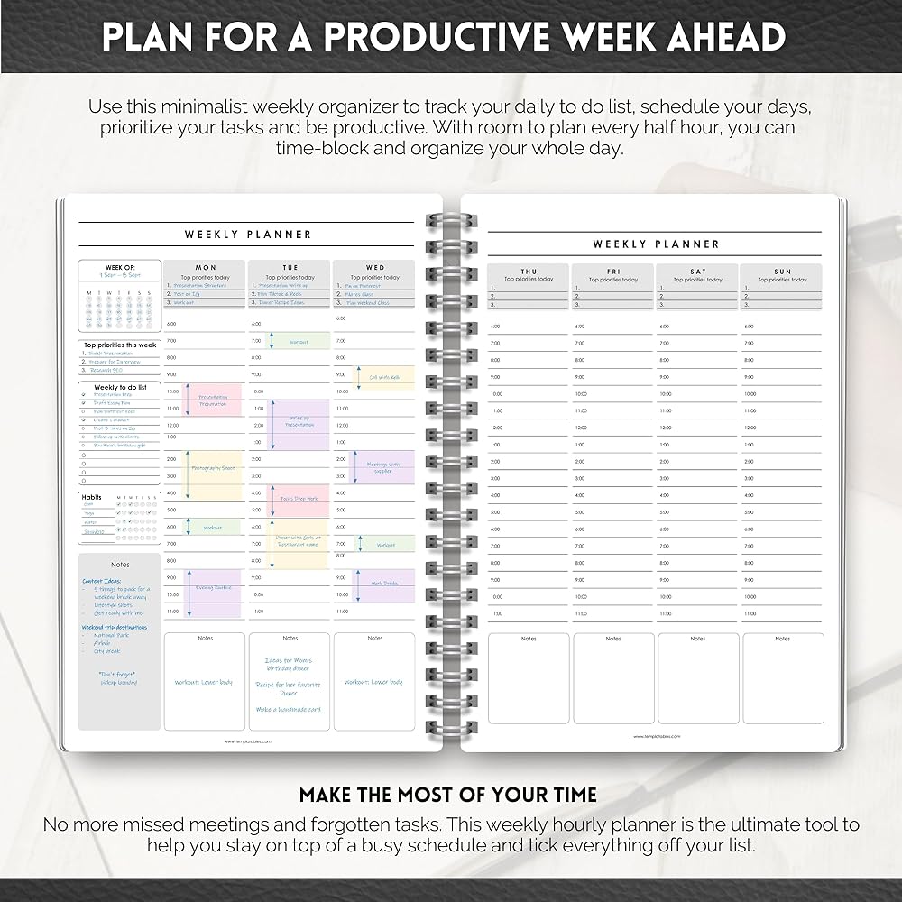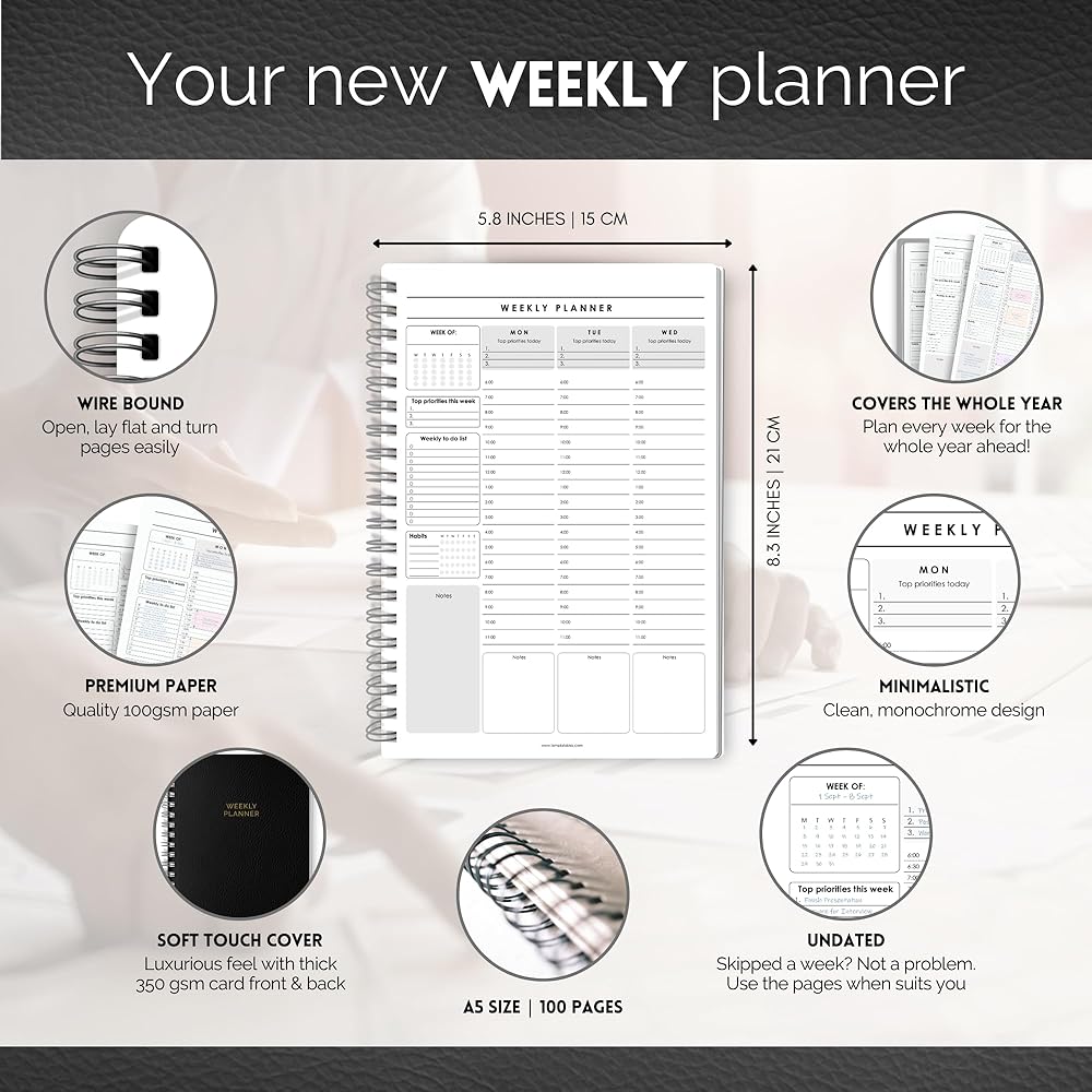 منظم مخطط أسبوعي وكل ساعة | الجدول الأسبوعي وقائمة المهام ومخطط الإنتاجية وإدارة الوقت - A5 Mono