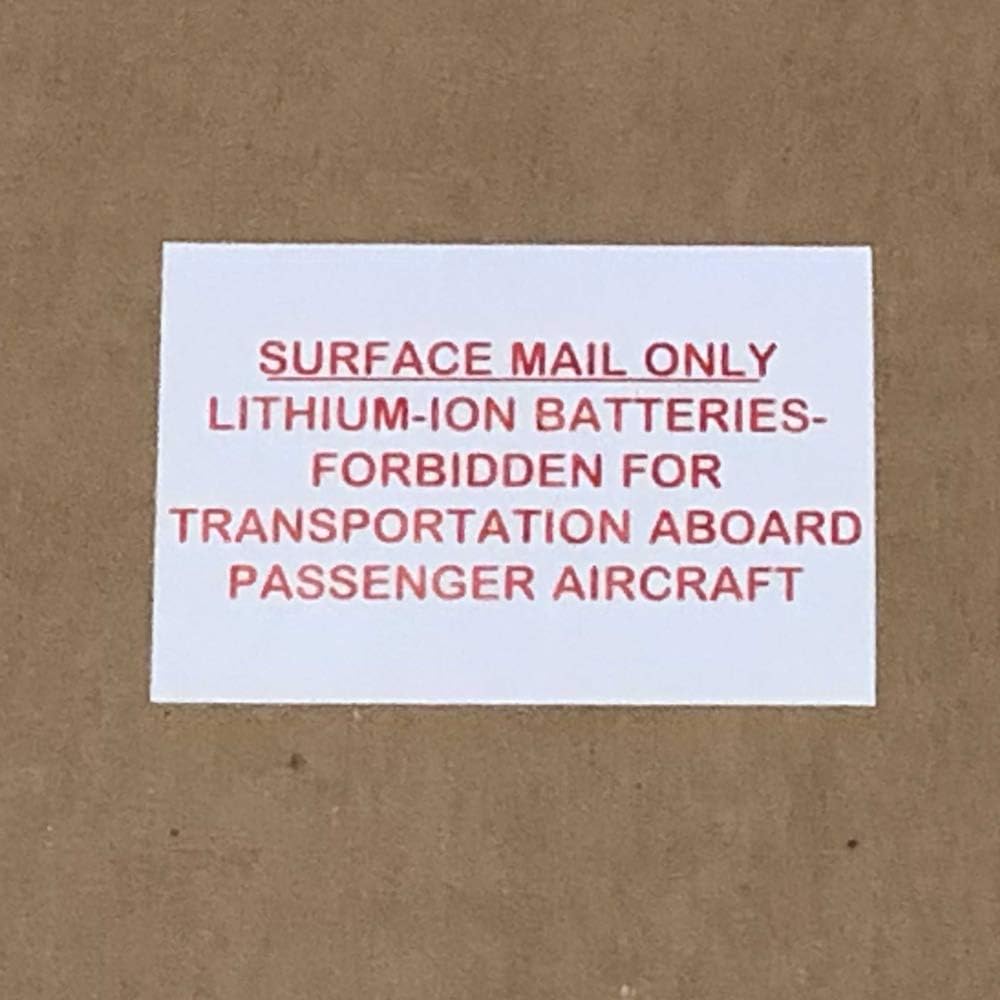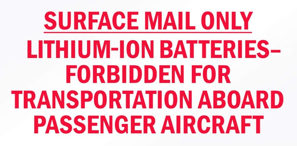 • Printed Design on Label: "SURFACE MAIL ONLY LITHIUM-ION BATTERIES - FORBIDDEN FOR TRANSPORTATION ABOARD PASSENGER AIRCRAFT"