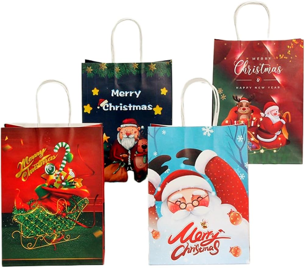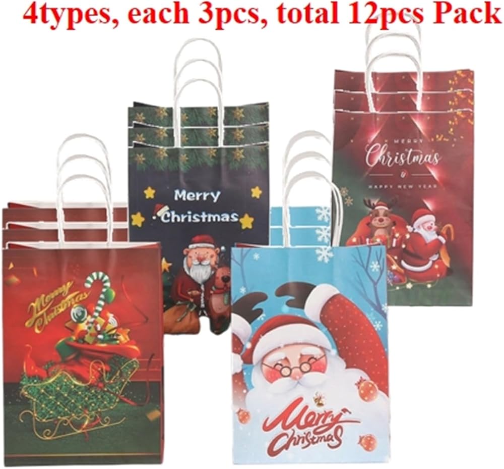 【PERFECT SIZE 】: Each Christmas kraft paper gift bag measures 8.26"×5.9"×3.15", and has a 7-8 cm handle. They are proper in size and can hold items such as Candies, biscuits, chocolates, cards, small toys, etc. Very suitable for Christmas holiday gift packaging. This set includes 12pieces kraft paper gift bags, 4 different holiday classic designs and each design has 3 pieces. Well packed give gifts to your neighbors, teachers, friends, customers, colleagues, etc.