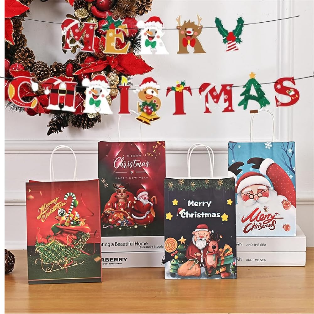 جيفلون 12 قطعة من أكياس هدايا عيد الميلاد بمقابض، وأكياس هدايا عيد الميلاد، وأكياس ورق كرافت بمقابض قوية، ومطبوعات عيد الميلاد المتنوعة لتفضلات الحفلات، والحلويات، والحلوى، والهدايا، والمكافآت