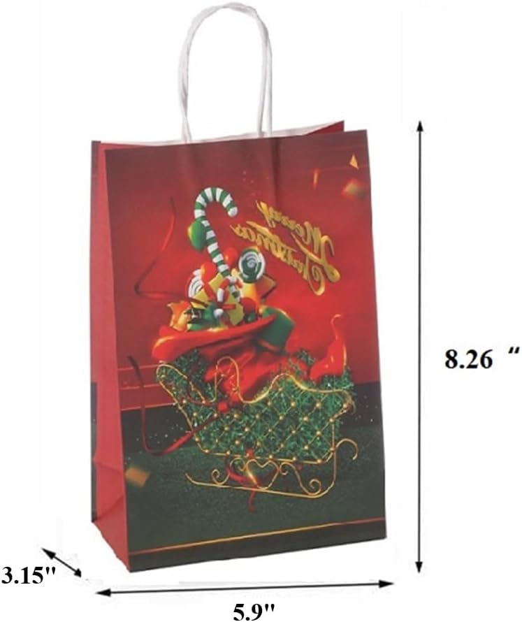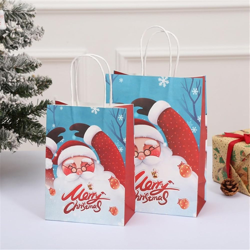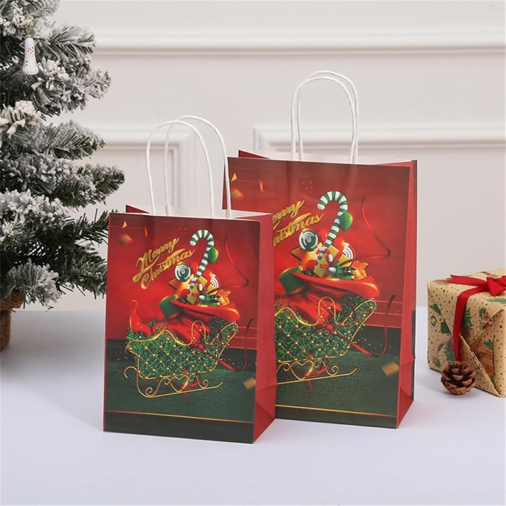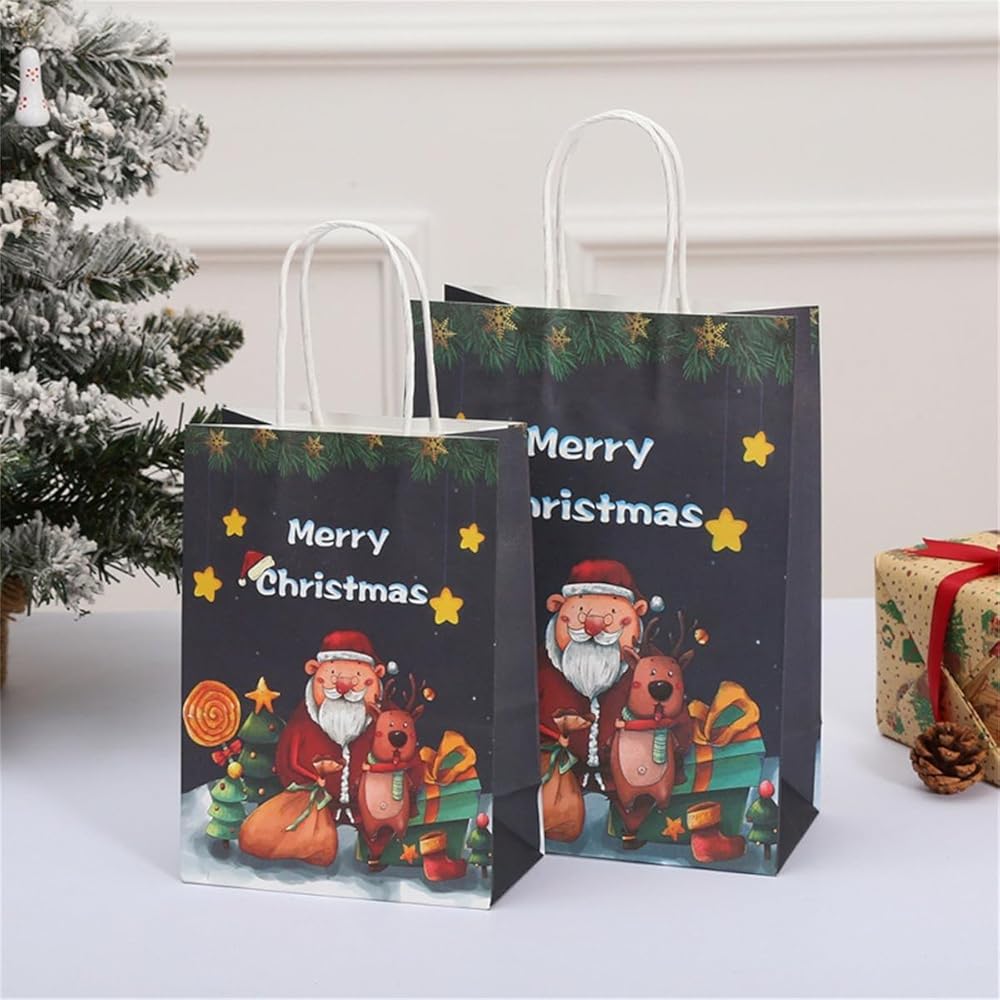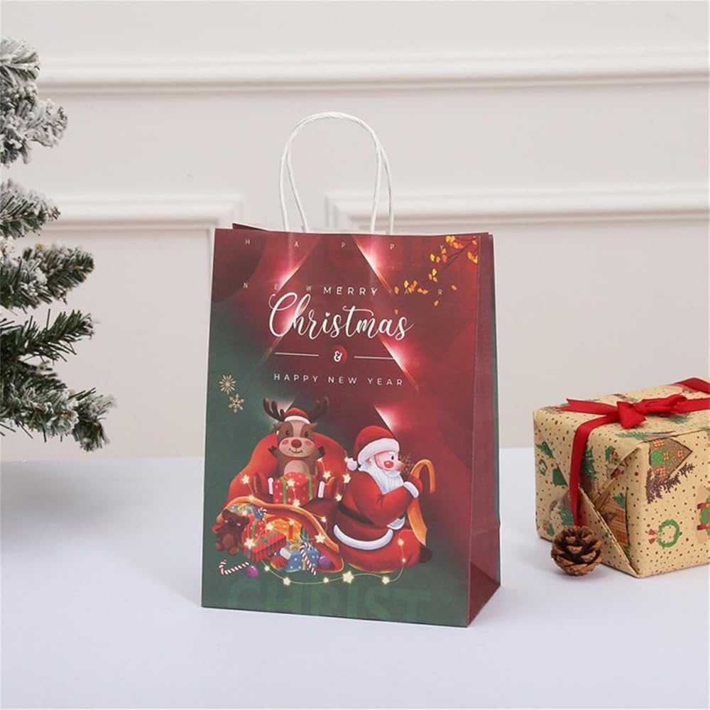 【CHRISTMAS KRAFT GIFT BAGS】: Made of high-quality kraft paper, the handle is fixed with high-quality glue. The Christmas paper bags are sturdy and durable enough, and can be used to carry gifts to reduce the risk of tearing. 100% recyclable, reusable and environmental, you can replace your smelly plastic bags with these super eco-friendly Christmas kraft paper bags.