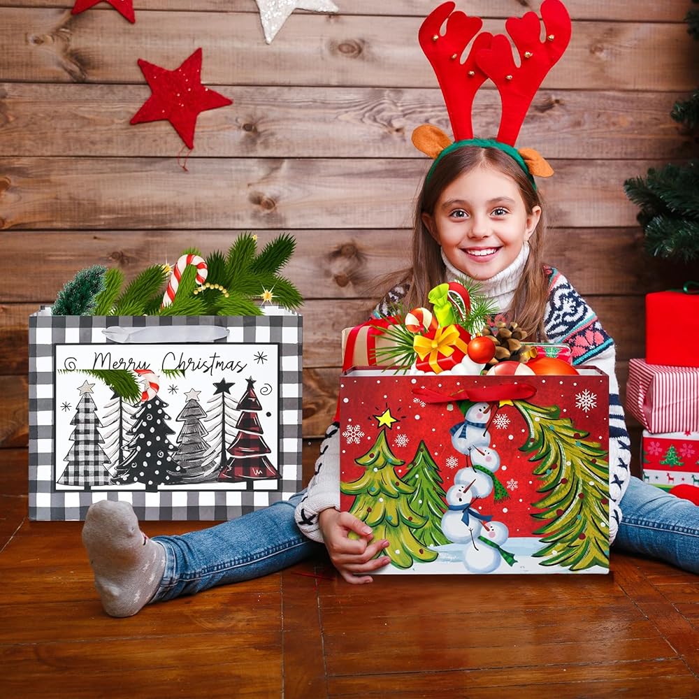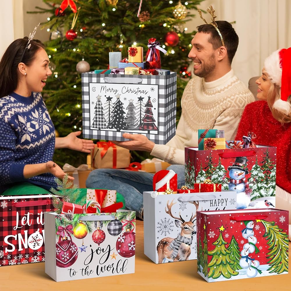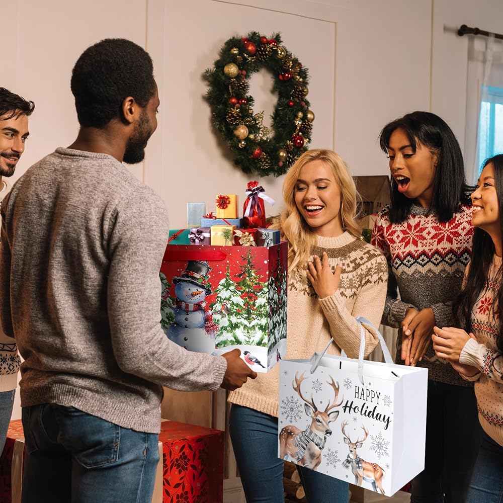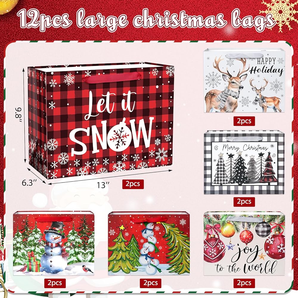 مجموعة حقائب هدايا عيد الميلاد الكبيرة: يوجد 12 حقيبة هدايا كبيرة لعيد الميلاد تتميز بـ 6 تصميمات مميزة، مقاس كل منها 6.3 × 9.8 × 13 بوصة. هذا المزيج الكلاسيكي والأنيق سيعزز عرض هداياك ويساعدك على خلق لحظات لا تنسى