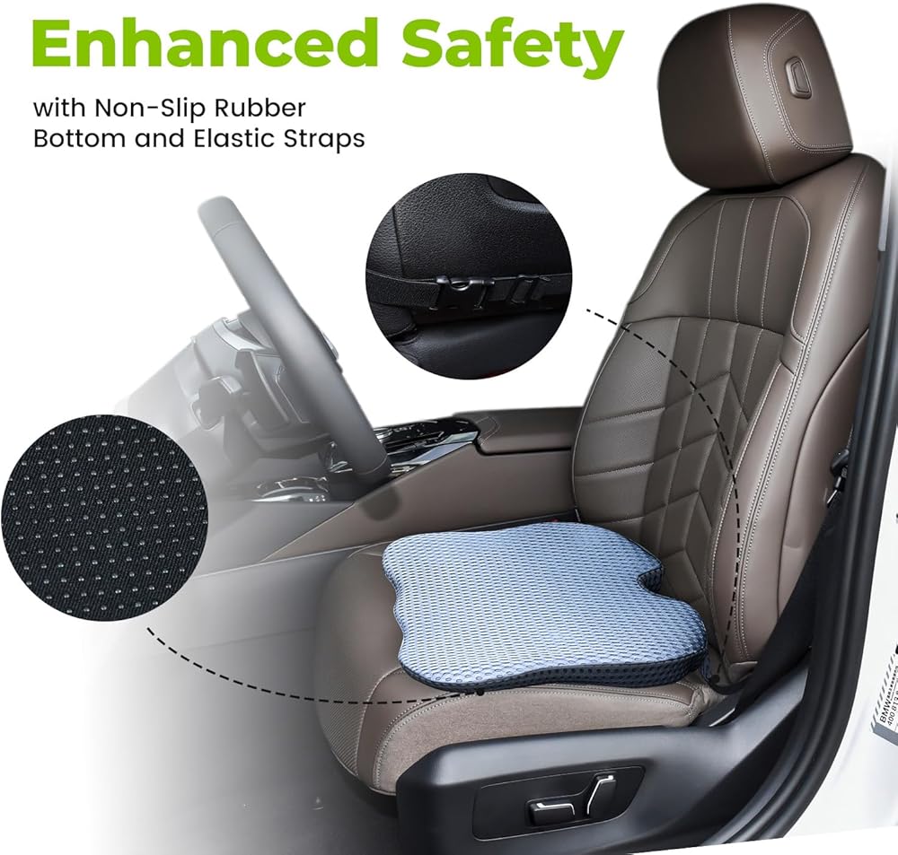 طريقة مختلفة لتوسيع رؤية القيادة: وسادة السيارة ذات الإسفين الخاصة بنا للقيادة ترفع الظهر بدلاً من الأمام، للحصول على رؤية أكثر وضوحًا دون رفع الركبتين. يمكن أن يقلل من الانزعاج عن طريق تجنب الركبتين بالقرب من عجلة القيادة