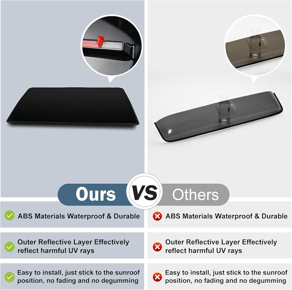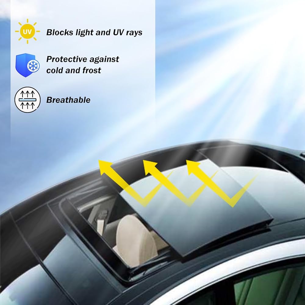 الحماية: يوفر غطاء فتحة سقف السيارة هذا حماية ممتازة عن طريق حجب ما يصل إلى 98% من الأشعة فوق البنفسجية الضارة، مما يقلل بشكل فعال من الحرارة والسطوع داخل السيارة. كما أنه يمنع دخول الأجسام الغريبة عبر فتحة السقف، مما يعزز السلامة والراحة