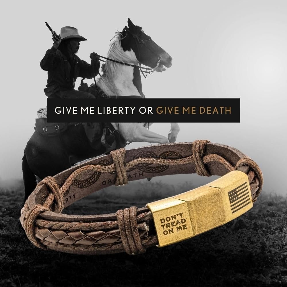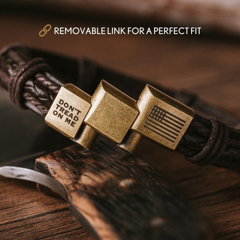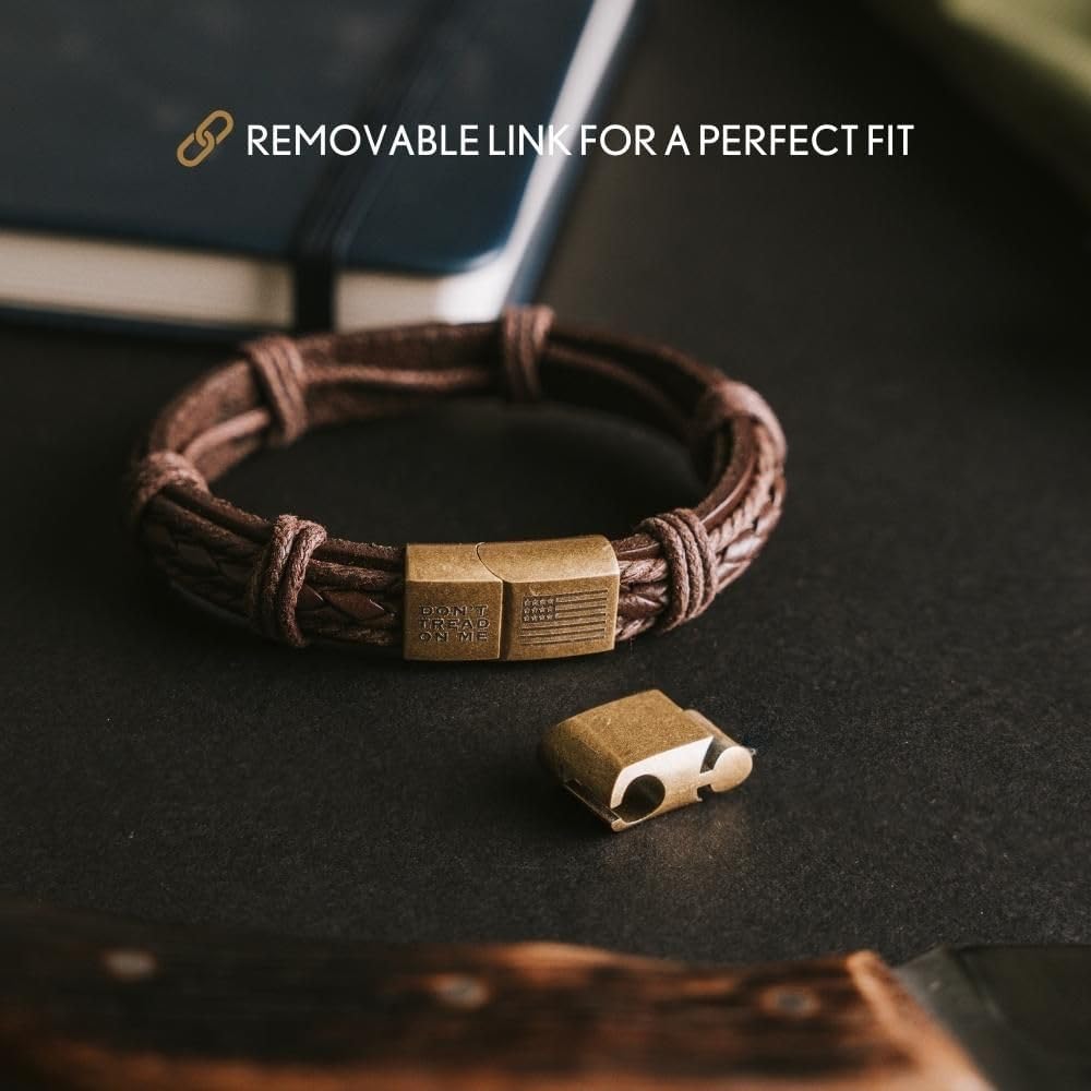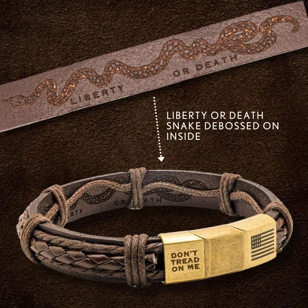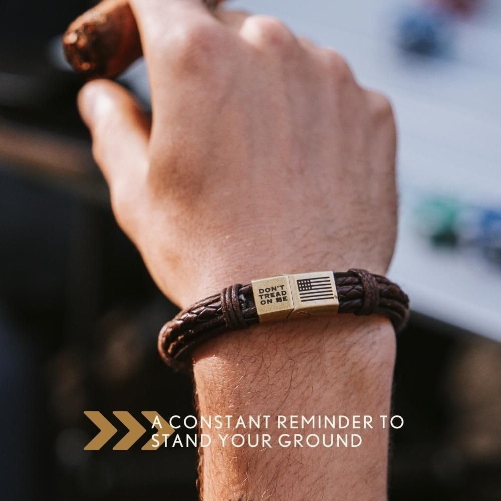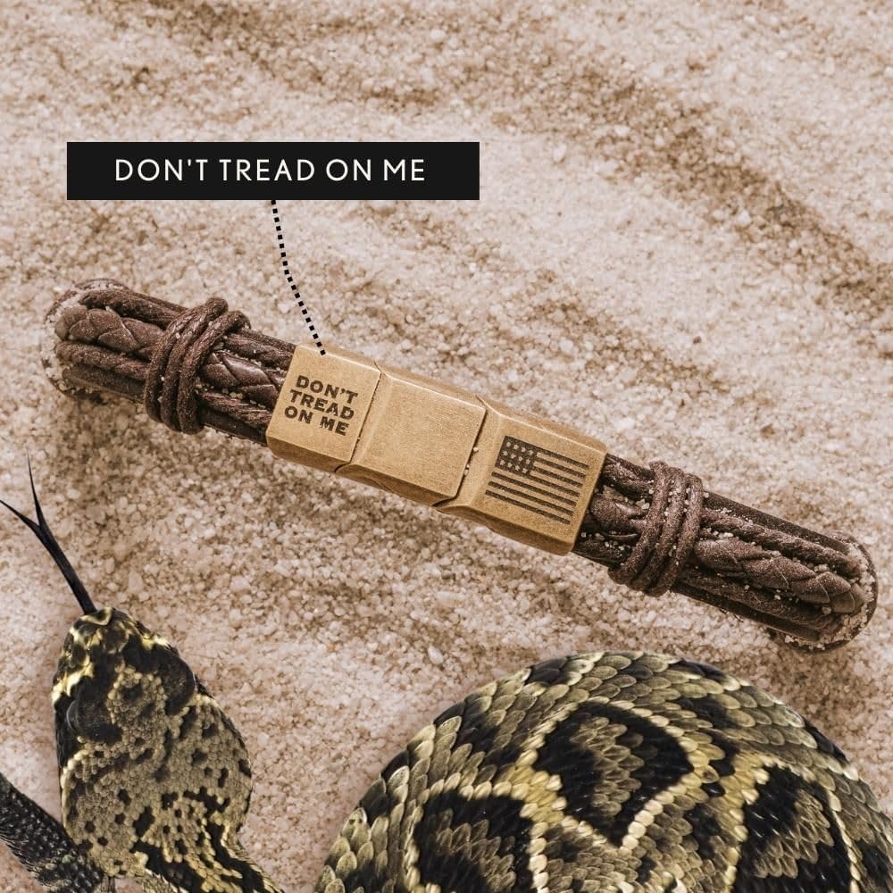 سوار Don't Tread on Me مصنوع من جلد متين بنفس قوة أسلافنا، ويوجد عبر السوار تصميم يشبه الأفعى الجرسية على علم جادسدن.