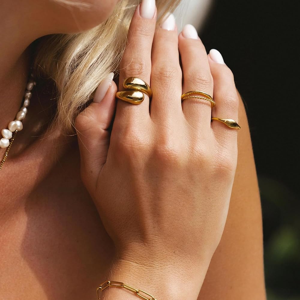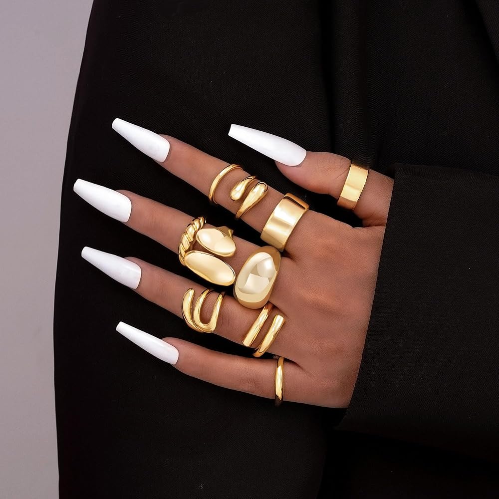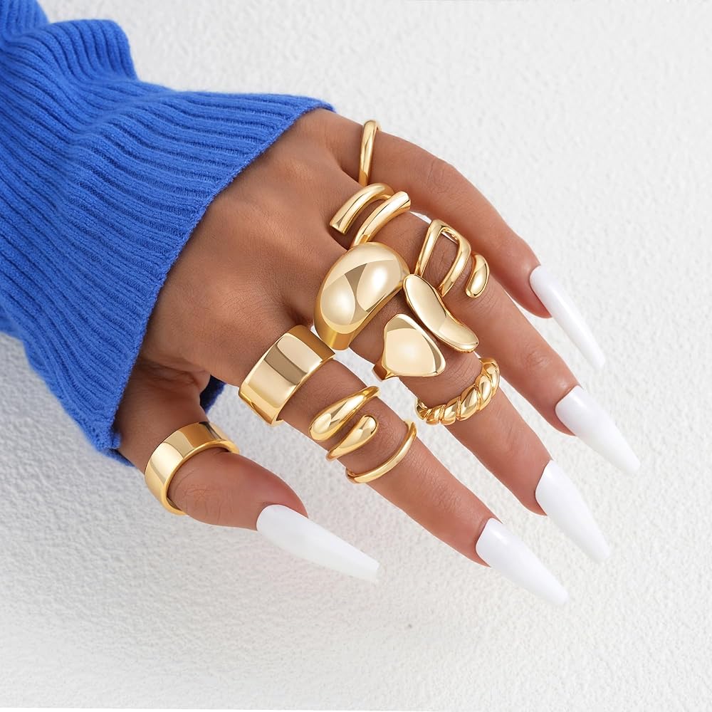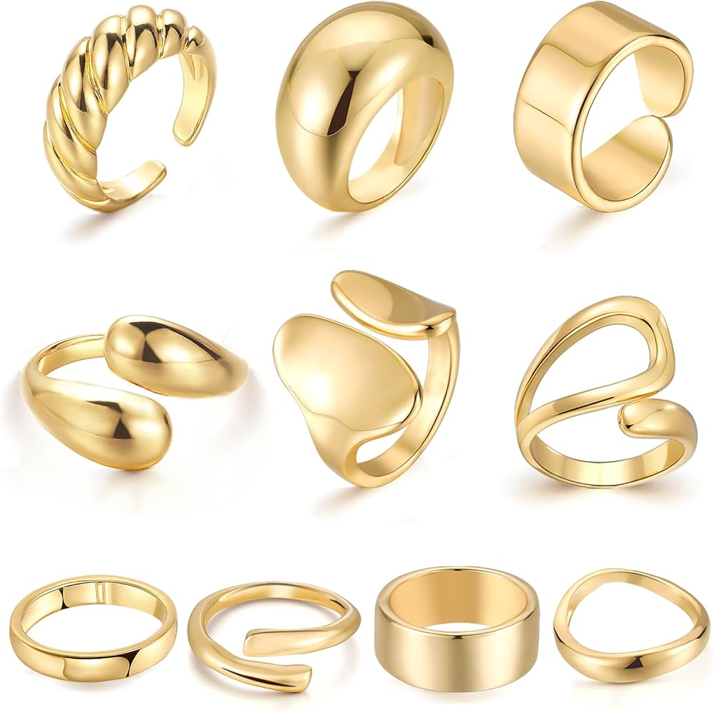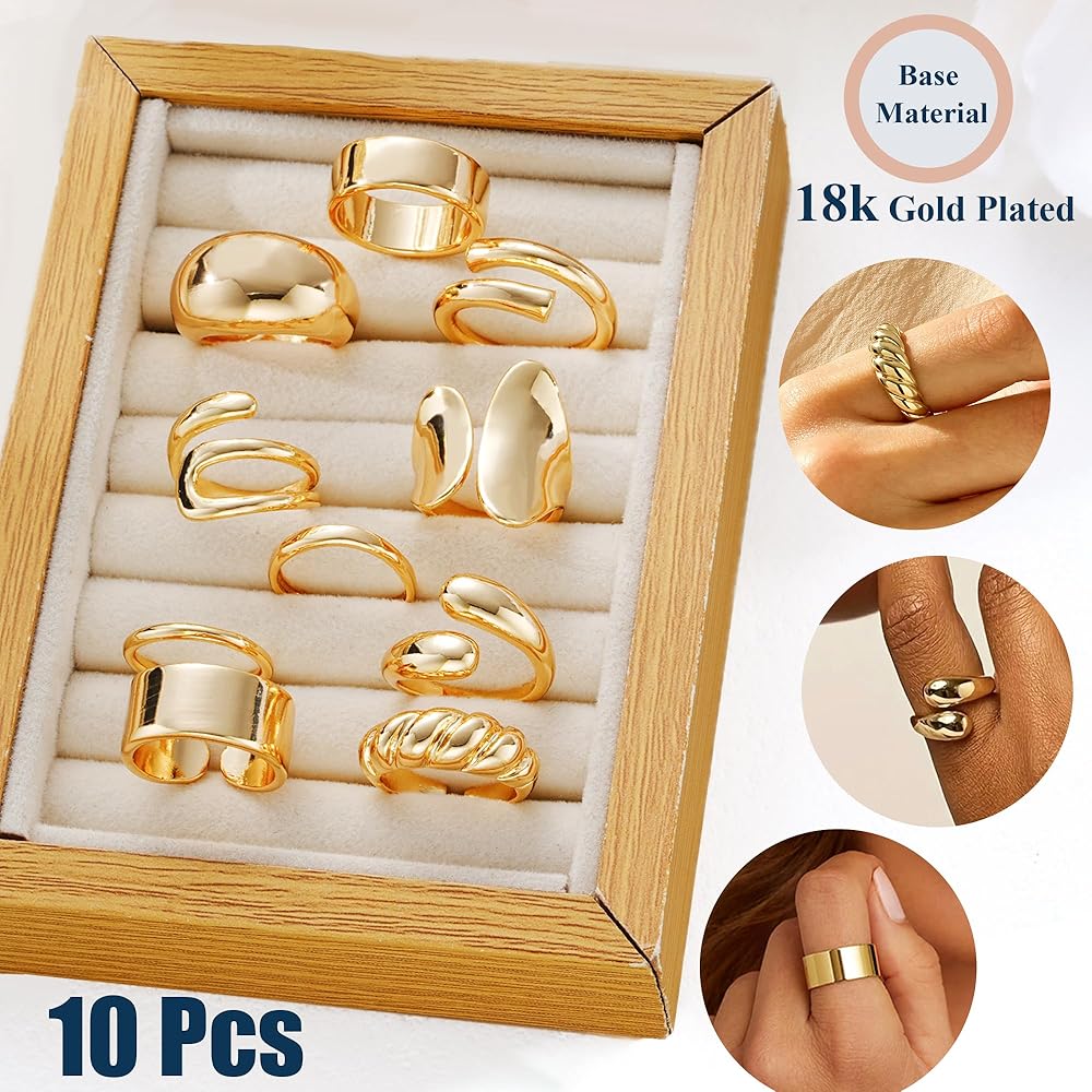 • خواتم ذهبية مميزة: يتضمن الطلب الواحد 10 قطع من الخواتم ذات الأنماط المختلفة، وخاتم ملتوي، وحلقة قبة، وخاتم كرواسون، وخاتم شريط، وما إلى ذلك. يمكن ارتداء هذه الخواتم الذهبية المكتنزة بمفردها أو مكدسة مع حلقات أخرى. الإكسسوار المثالي للارتداء اليومي أو المناسبات الخاصة لإضافة لمسة من الأناقة والمعنى.