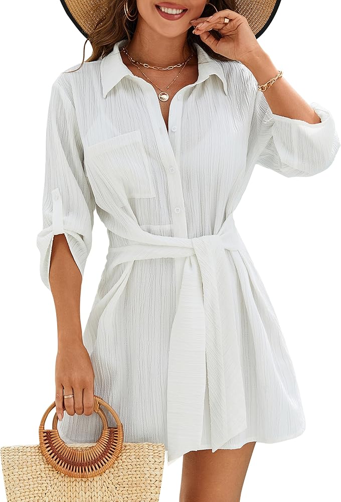 غطاء بدلة السباحة للسيدات: يتميز بياقة قميص، نصف كم مع أساور بأزرار، يمكن ارتداؤه بسهولة من الأسفل إلى الأعلى. تصميم ربطة أمامية، يمكن تعديله حسب الرغبة، مثالي لإظهار منحنياتك المثيرة.