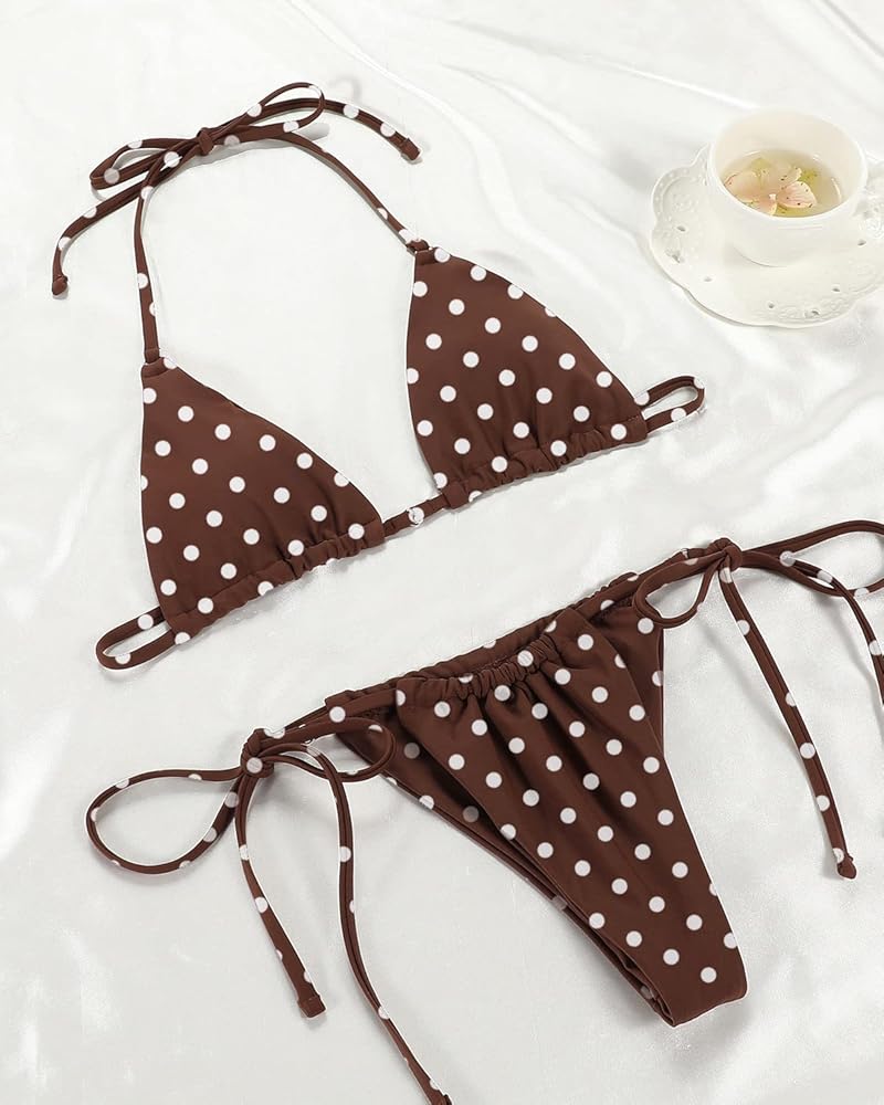 • ملابس سباحة بكيني بشريط جانبي: جزء علوي من بيكيني بأشرطة، وجزء سفلي من بيكيني بخيط رفيع. مع إكسسوارات معدنية دائرية صغيرة، أضف سحر الموضة الخاص بك.