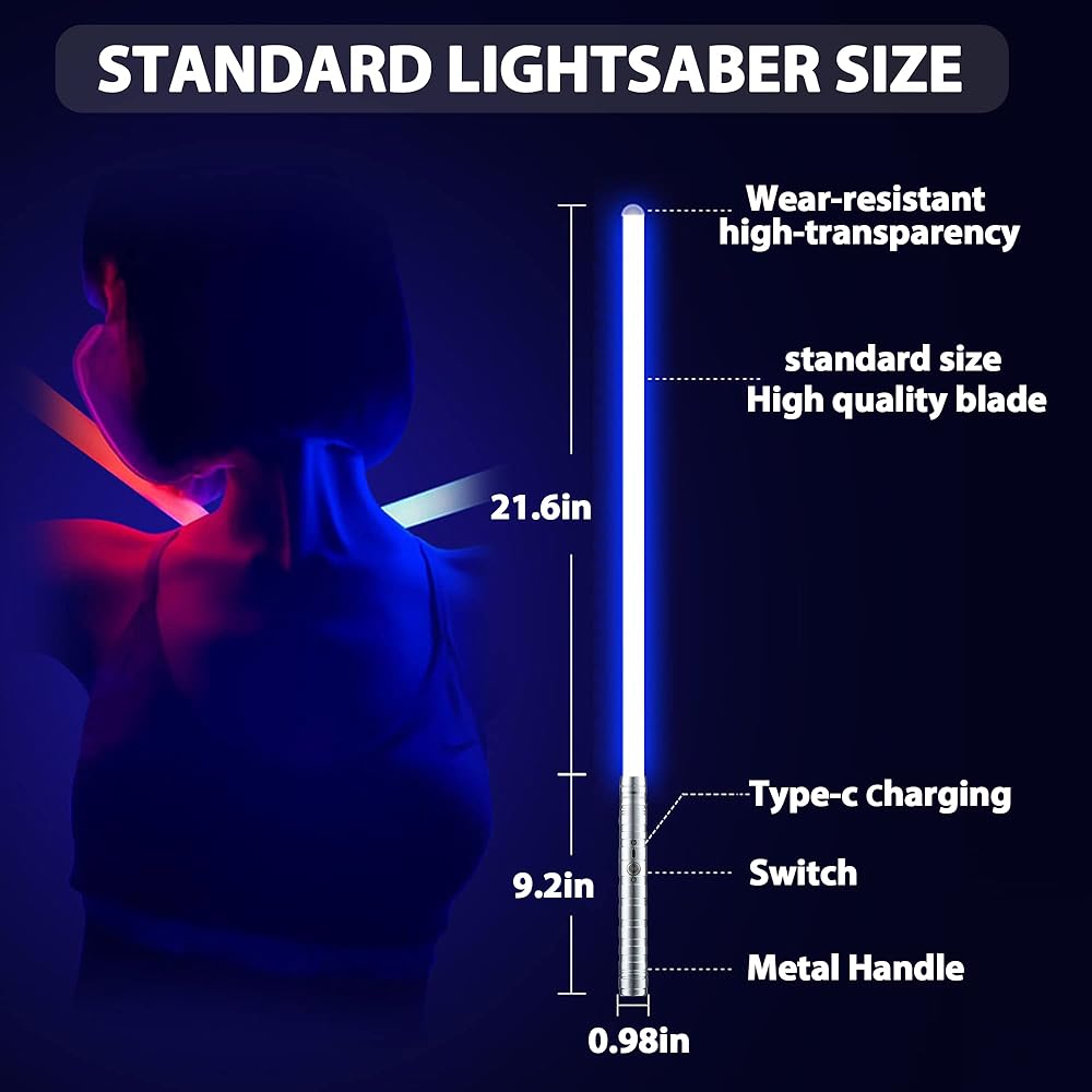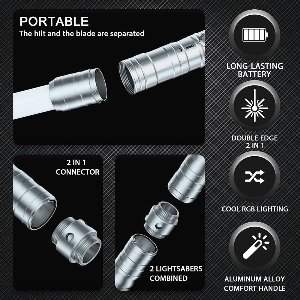 【2 في 1 سيف ضوئي مبارز】شفرة السيف الضوئي متينة والألوان مشرقة. تم تصميم الشفرة لتحمل التأثيرات الثقيلة دون أن تتشقق أو تنكسر. 15 لونًا متغيرًا مع 4 أوضاع و6 تأثيرات صوتية: تشغيل الصوت، صوت إيقاف التشغيل، صوت التبديل، صوت فرقعة، صوت تصادم، صوت حلقة. يمكن تشغيل وإيقاف كتم الصوت في أي وقت.