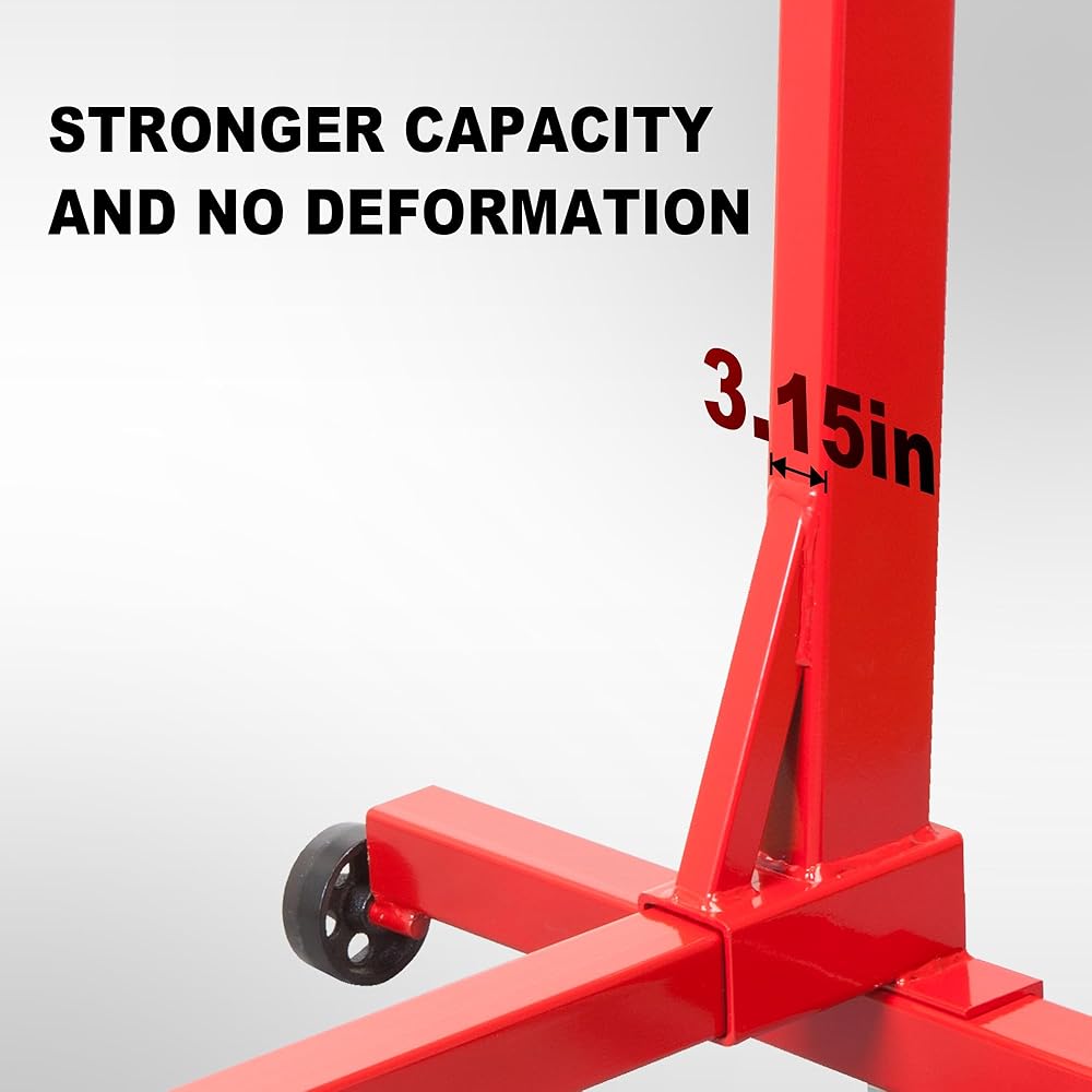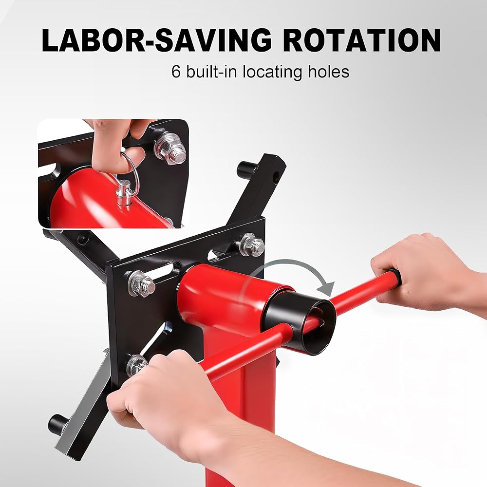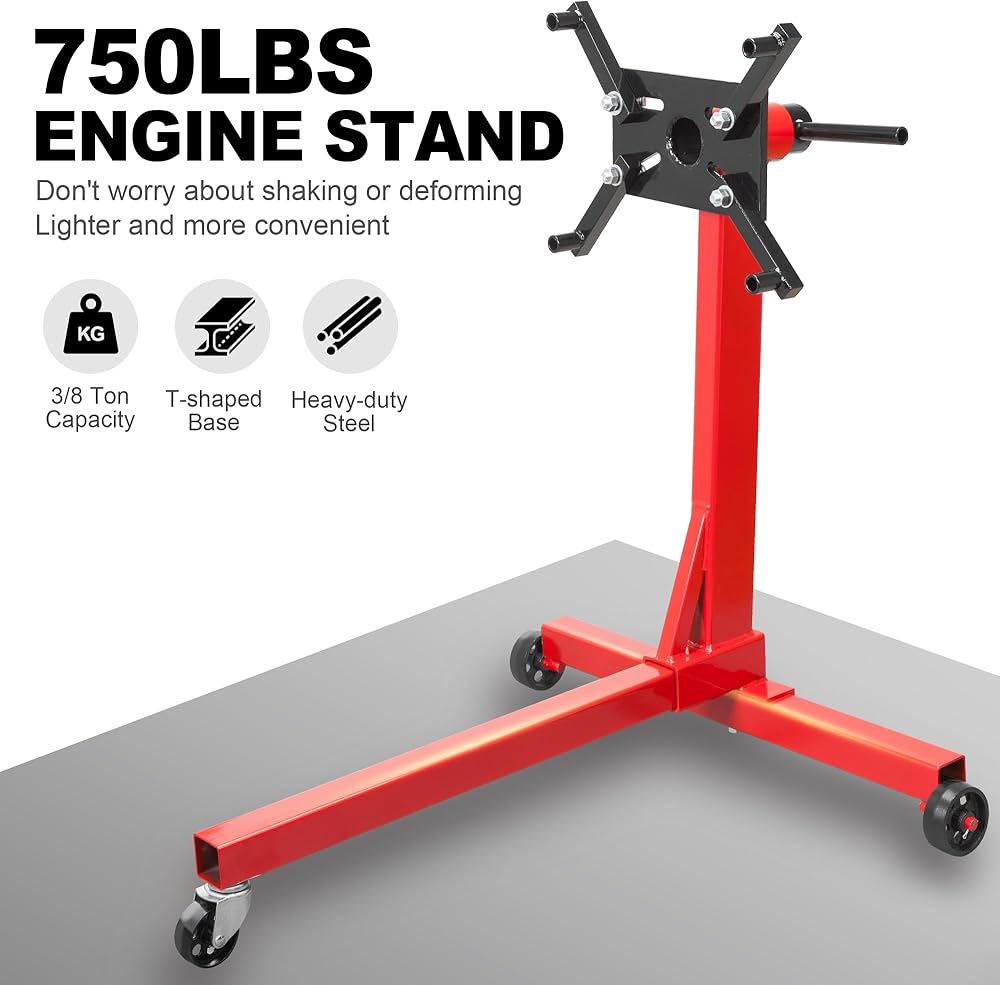 The BIG RED steel rotating engine stand is constructed with heavy duty steel providing long term durability with an industrial luster. A built-in steel tray helps you to keep essential tools and parts nearby and organized. The mounting head features (4) adjustable arms and 360-degree rotation, allowing for easy access to any part of the engine and easy procedure to install. It securely holds most foreign and domestic engine blocks. This rotating engine stand features a 5/8 ton (1,250 lb.) load capacity and is equipped with (2) fixed casters and (2) 360-degree swivel casters for smooth maneuverability. A powder coated finish helps deliver rust resistance. However, be sure to read the product manual for the complete conditions and restrictions.