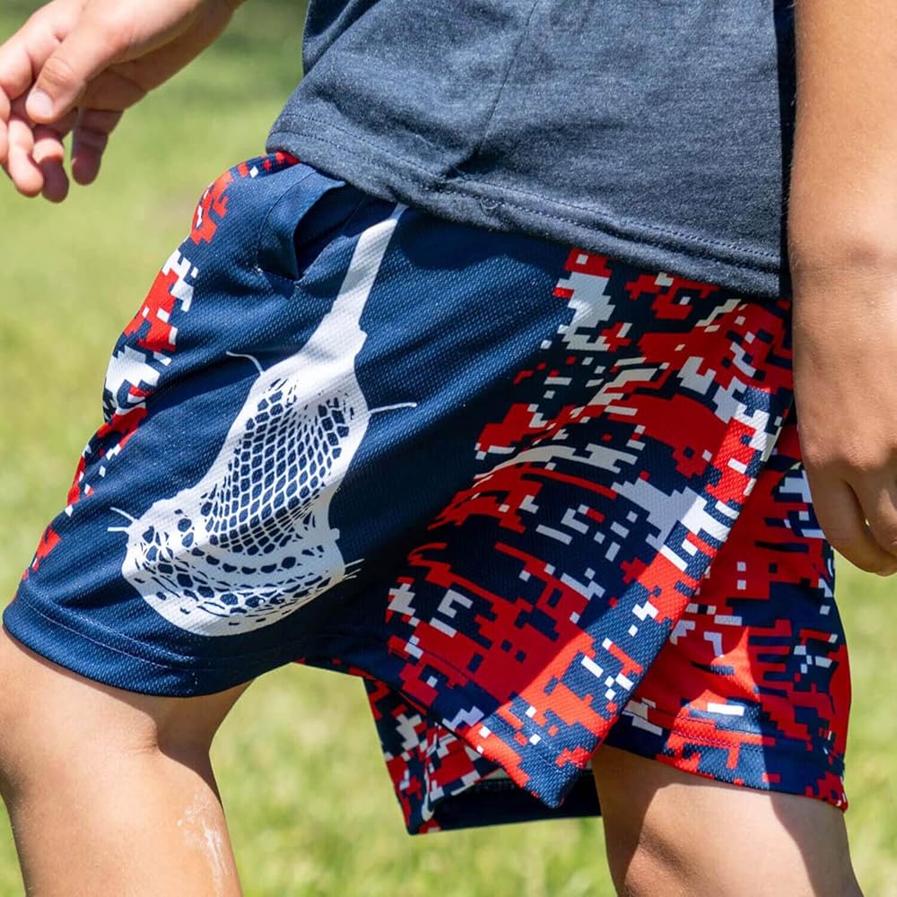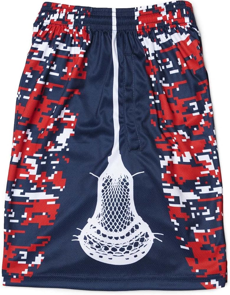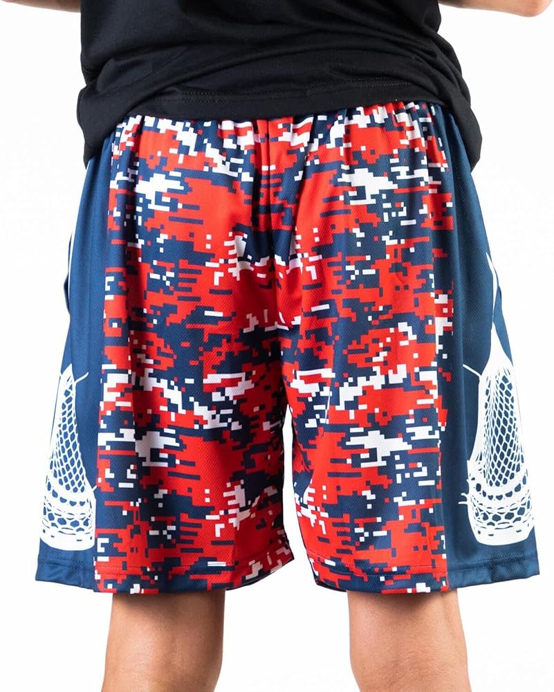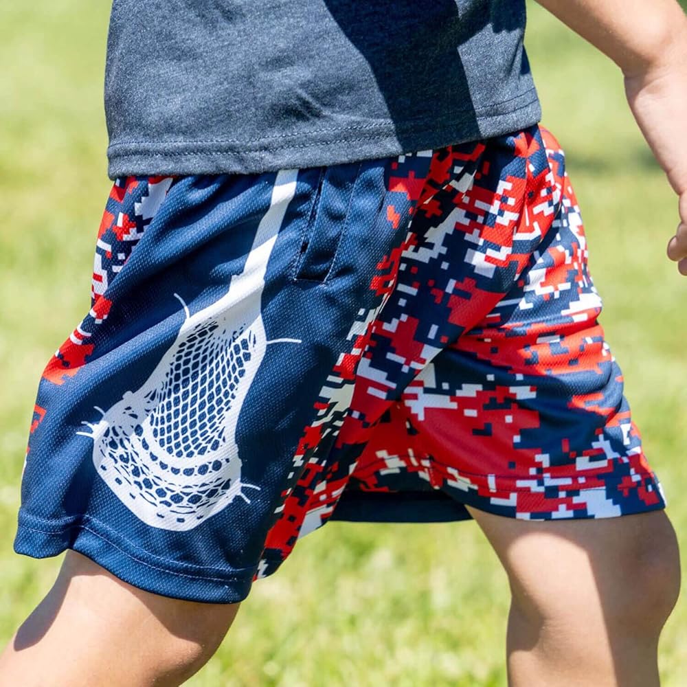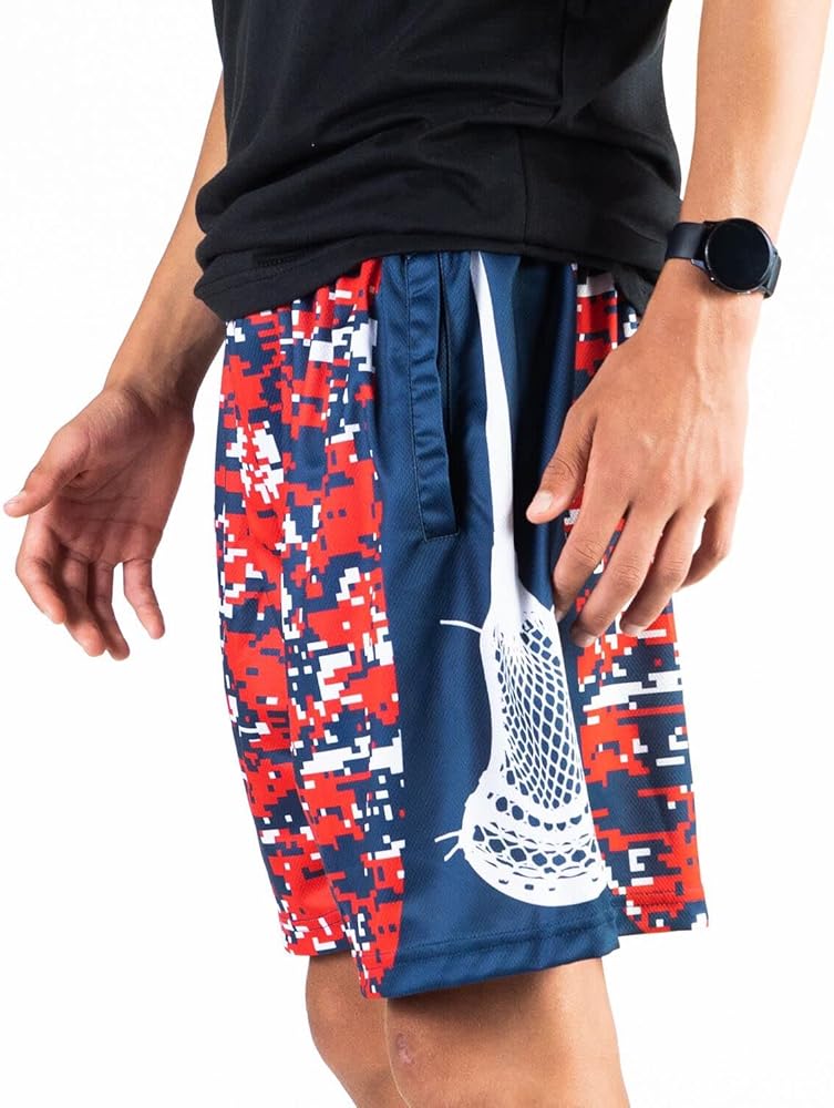 DESIGNED IN THE USA: Lacrosse Shorts for youth and adults designed in Connecticut. Crafted from top-tier 100% moisture-wicking polyester, our Patriotic Digital Camo lax shorts offer advanced breathability and durability with a double-layered design, adjustable waistband, and two side pockets.