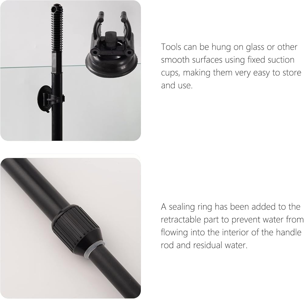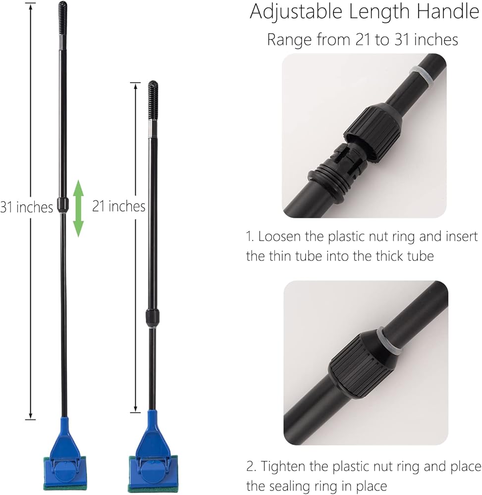 This fish bowl cleaning tool has a telescopic handle, The long handle can be adjusted in a length range of 21 inches to 31 inches, and its flexible length allows it to touch every corner of the fish tank without wetting your hands.