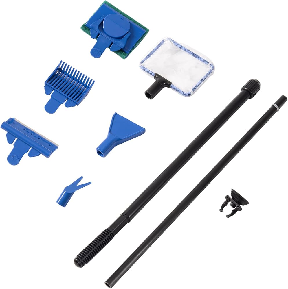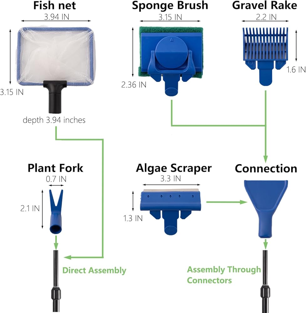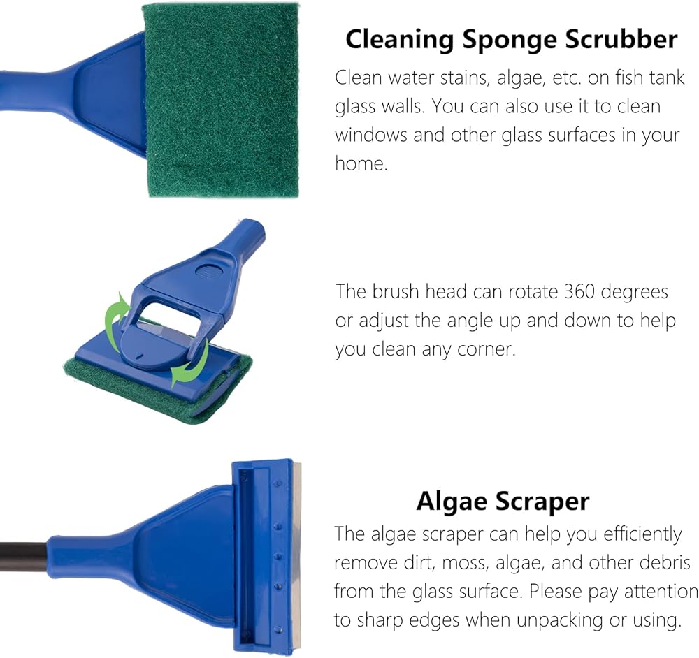 This multifunctional aquarium cleaning tool can help you easily complete multiple tasks. You can use a grass clamp to plant aquatic plants, use a fish tank scrubber to clean glass, use a rake to tidy up the bottom gravel, use a scraper to clean algae, use a fishing net to catch fish, or collect floating debris.