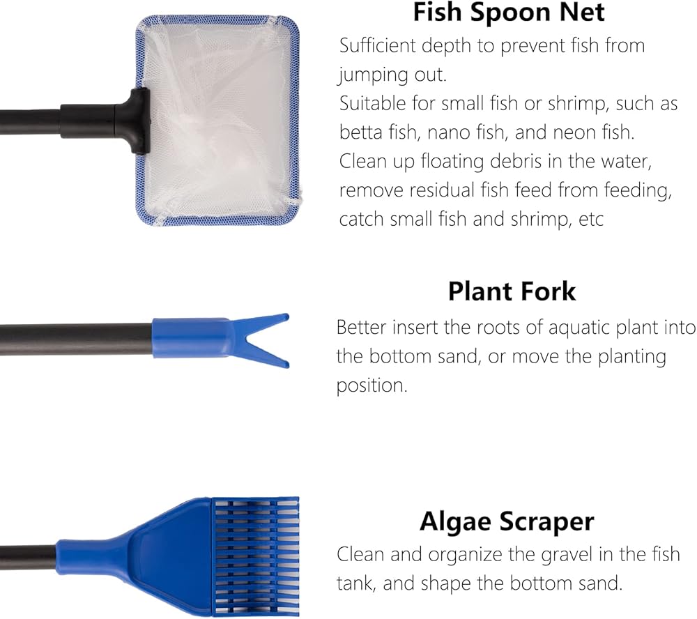 This fish tank accessory kit is equipped with 5 tools, namely spoon net, cleaning sponge, plant fork, gravel rake, and algae scraper. It makes cleaning and maintenance of your fish tank simple, and all tasks can be completed with just one tool.