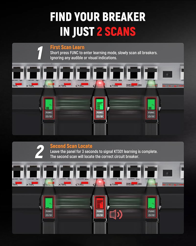تحديد دقيق للدائرة: يمكنك تحديد موقع القاطع الصحيح بسرعة وبدقة باستخدام أداة البحث عن قاطع الدائرة، والتي تحدد الهدف من خلال عمليتي مسح فقط. يتعرف الفحص الأول تلقائيًا على اللوحة الكهربائية، ويحدد الفحص الثاني القاطع دون الحاجة إلى تعديلات يدوية للحساسية. وهذا يضمن استكشاف الأخطاء وإصلاحها بشكل فعال وموثوق لأي خطأ كهربائي