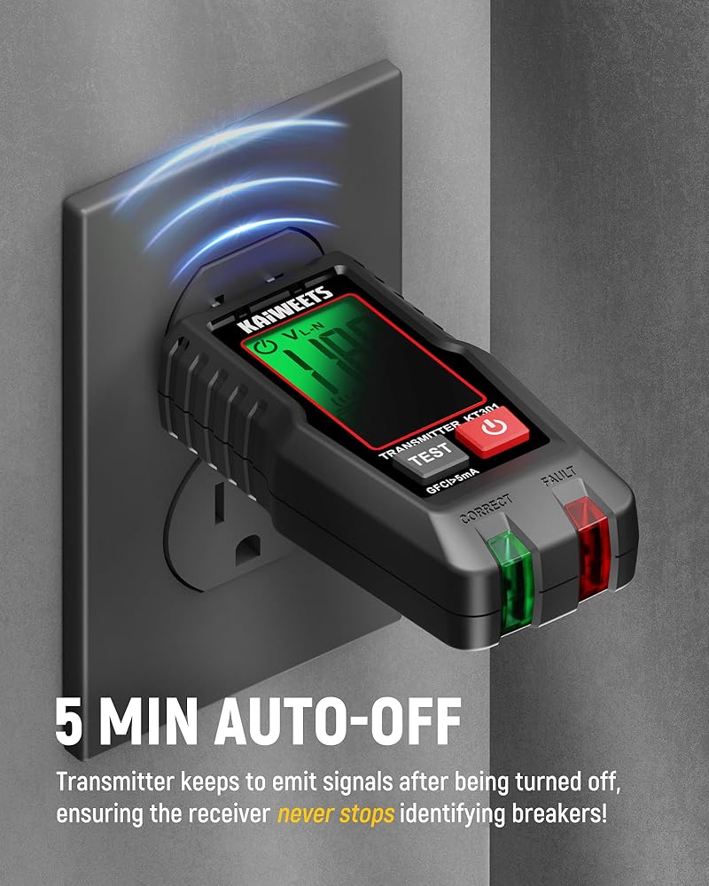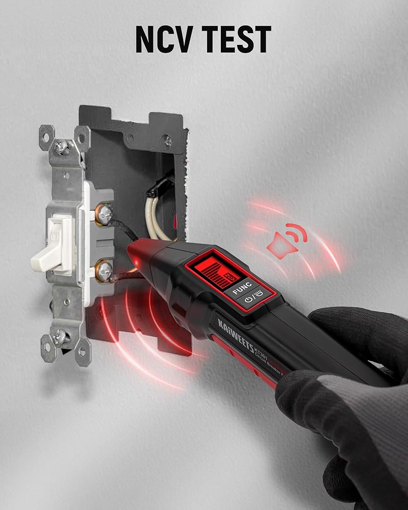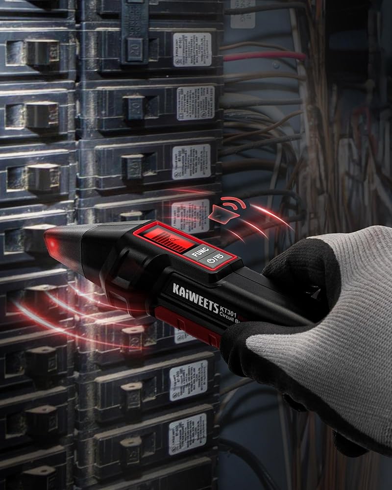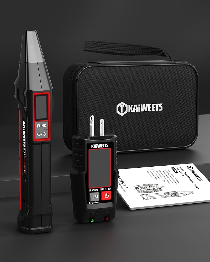 جهاز البحث عن قاطع الدائرة الكهربائية من KAIWEETS مع شاشة LCD، واختبار NCV ومصباح يدوي، واختبار كهربائي واختبار الجهد الكهربي مع جهاز اختبار منفذ GFCI المتكامل، يتضمن حقيبة حمل - KT301