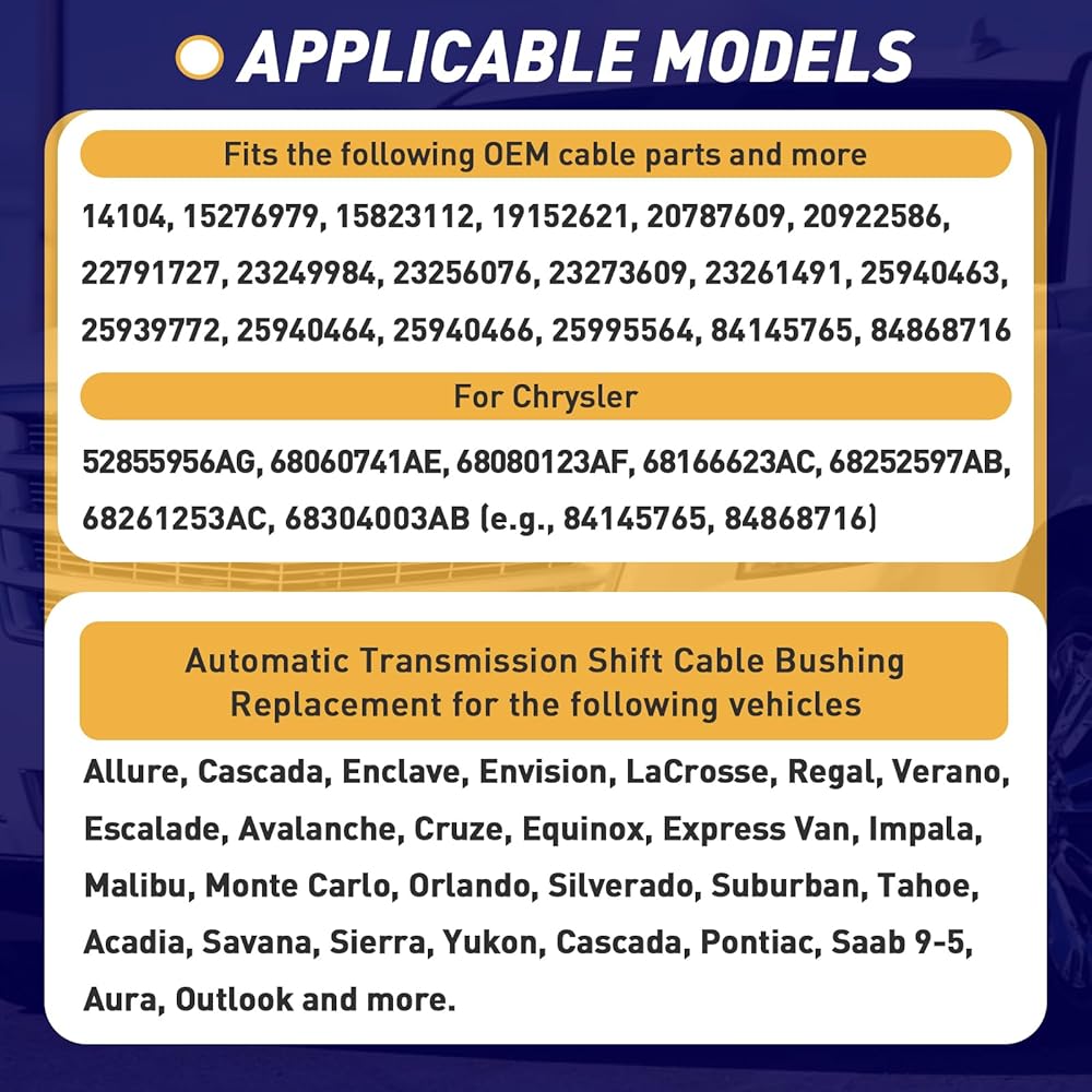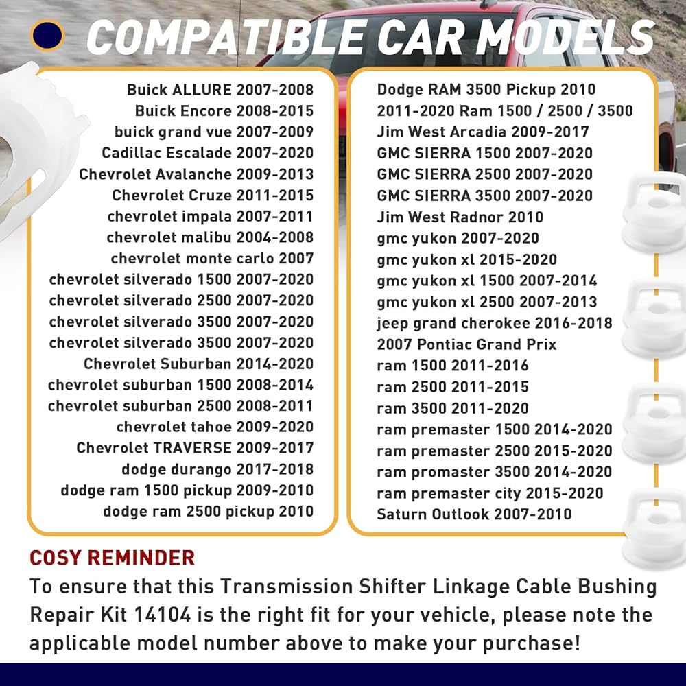 الملاءمة: تم تصميم مجموعات جلبة ذراع النقل 14104 لنماذج محددة، بما في ذلك Buick Allure وEnclave وLaCrosse، بالإضافة إلى Jeep Grand Cherokee وPontiac Grand Prix