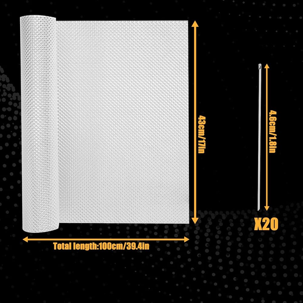 Complete Kit Included—The embossed aluminum heat shield kit comes with 20 stainless steel zip ties, ensuring secure and hassle-free installation. This aluminum heat shield kit provides convenience and reliability for firewalls, undercarriages, or exhaust systems.