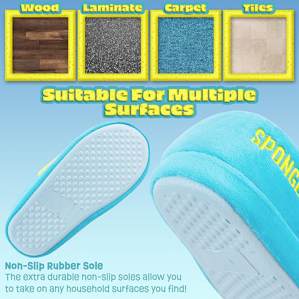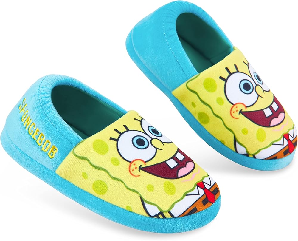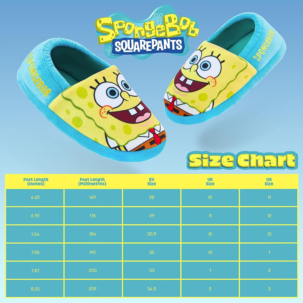 SpongeBob Kids Slippers Keep the little ones warm and cosy at home with these cute SpongeBob slippers Official SpongeBob merchandise for kids One of the kids favourite cartoon characters The perfect SpongeBob gifts for boys or girls Ideal for Christmas, birthday, stocking fillers for kids Kids sizes: 11-3 Elasticated back Non-slip sole Fun character slippers for kids