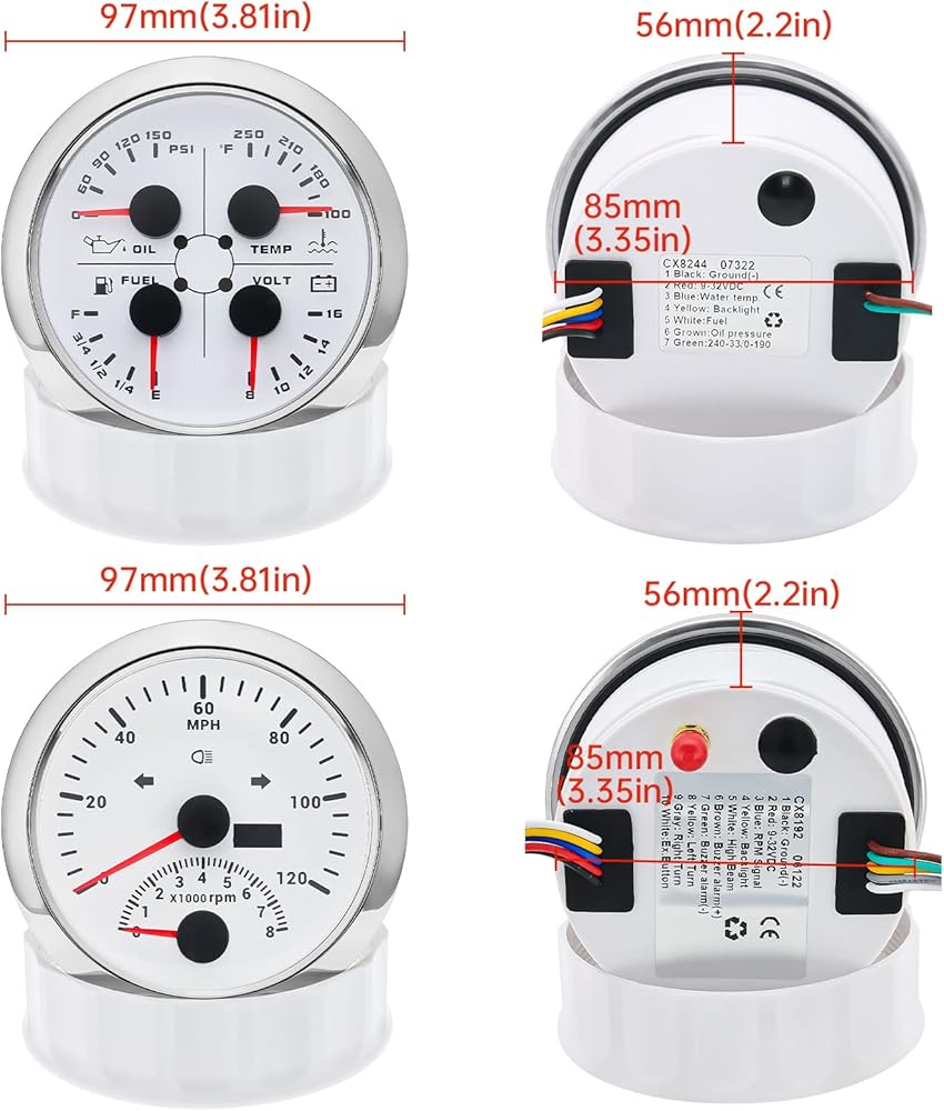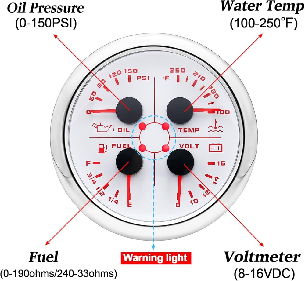 【مقياس 4 في 1 متعدد الوظائف 】رسالة إنذار، 1. إنذار الوقود <13%، 2. إنذار ضغط الزيت <11.6 رطل لكل بوصة مربعة، 3. درجة حرارة الماء. > 203 درجة فهرنهايت، إنذار، 4. إنذار الجهد <11.5 فولت. معلمة الإدخال (لن يتم تضمين المستشعر)، مستشعر ضغط الزيت: 10 ~ 184 أوم، مستشعر درجة الحرارة: 301 ~ 22 أوم، مستشعر مستوى الوقود: 0 ~ 190 أوم أو 240 ~ 33 أوم