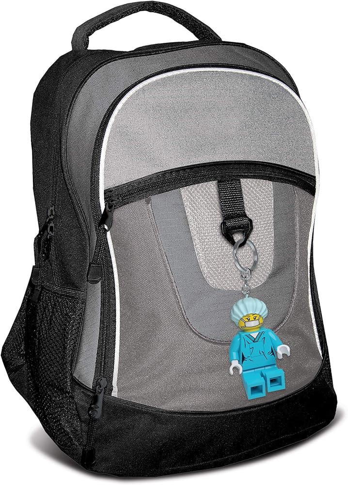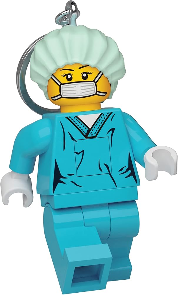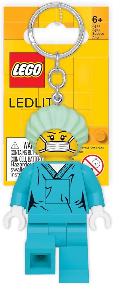 سلسلة مفاتيح LEGO Surgeon مرخصة رسميًا تتميز بمصابيح LED في القدمين والأذرع والساقين والرأس ومفتاح تشغيل/إيقاف في الصدر.