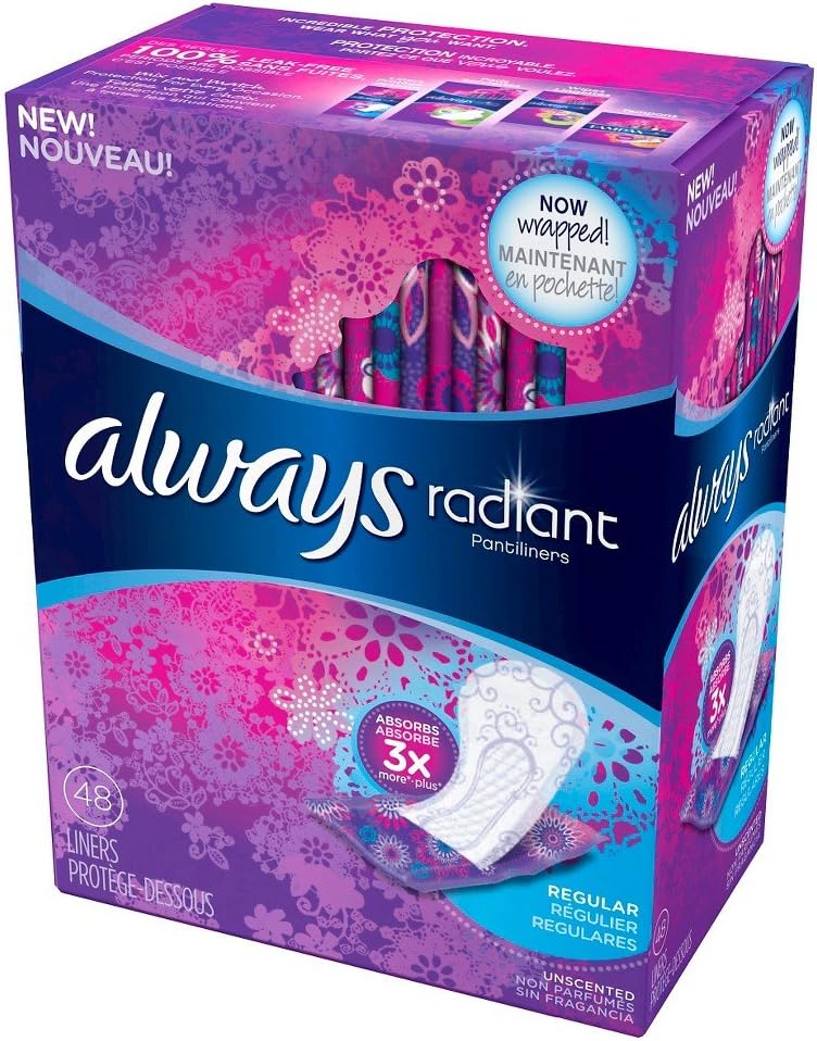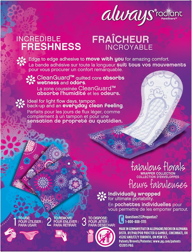 Always Radiant Daily Liners absorb 3X more*, so you can start the day fresh every day and stay that way. These pantiliners are individually wrapped so you can keep one in your purse for on-the-go liner protection and to stay fresh throughout the day. CleanGuard quilted core absorbs wetness and odors while the stay-in-place design moves with you for amazing comfort. Always Radiant panty liners for women are a great solution for light-flow days or as a tampon back-up or for an everyday clean feeling. *Vs. Always Sheer