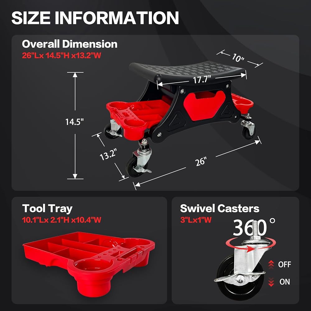 【تصميم مريح】: يبلغ مقاس المقعد الدوار متعدد الوظائف 66 سم طولًا × 14.5 سم ارتفاعًا × 13.2 سم عرضًا بشكل عام، وهو مصمم بعجلتين دوارتين قابلتين للقفل؛ وضع المقعد المرتفع، إلى جانب شكله المقعر المصمم بعناية يبقيك في مكانه أثناء العمل المناورة، عند القيام بإصلاحات السيارة أو غيرها من المهام، ليست هناك حاجة للانحناء بشكل متكرر!