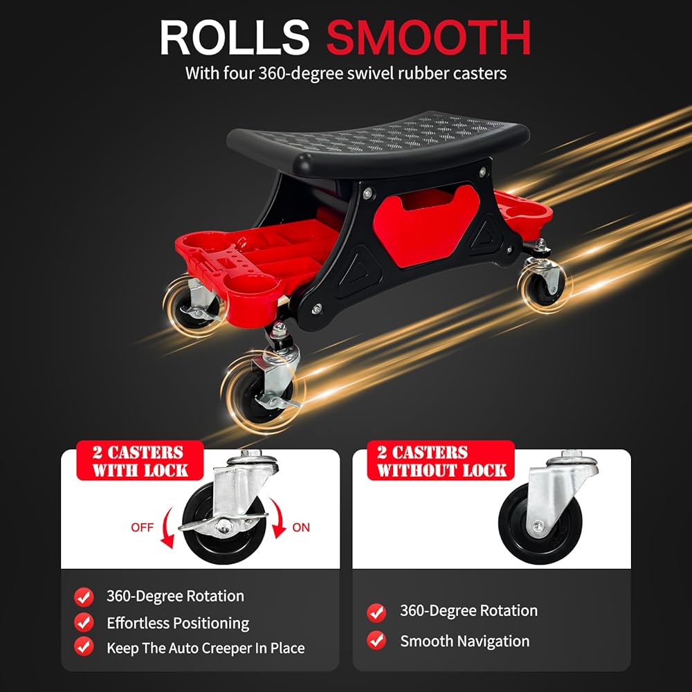 【يتدحرج بسلاسة】: يتميز المقعد الزاحف الميكانيكي لمتجر الجراج بأربع عجلات مطاطية دوارة بزاوية 360 درجة لوضع سهل، والتنقل السلس على الصدمات والدوران في أي اتجاه أثناء العمل. وقبعتان بعجلات قفل تحافظ على الزاحف التلقائي في مكانه أثناء العمل. .