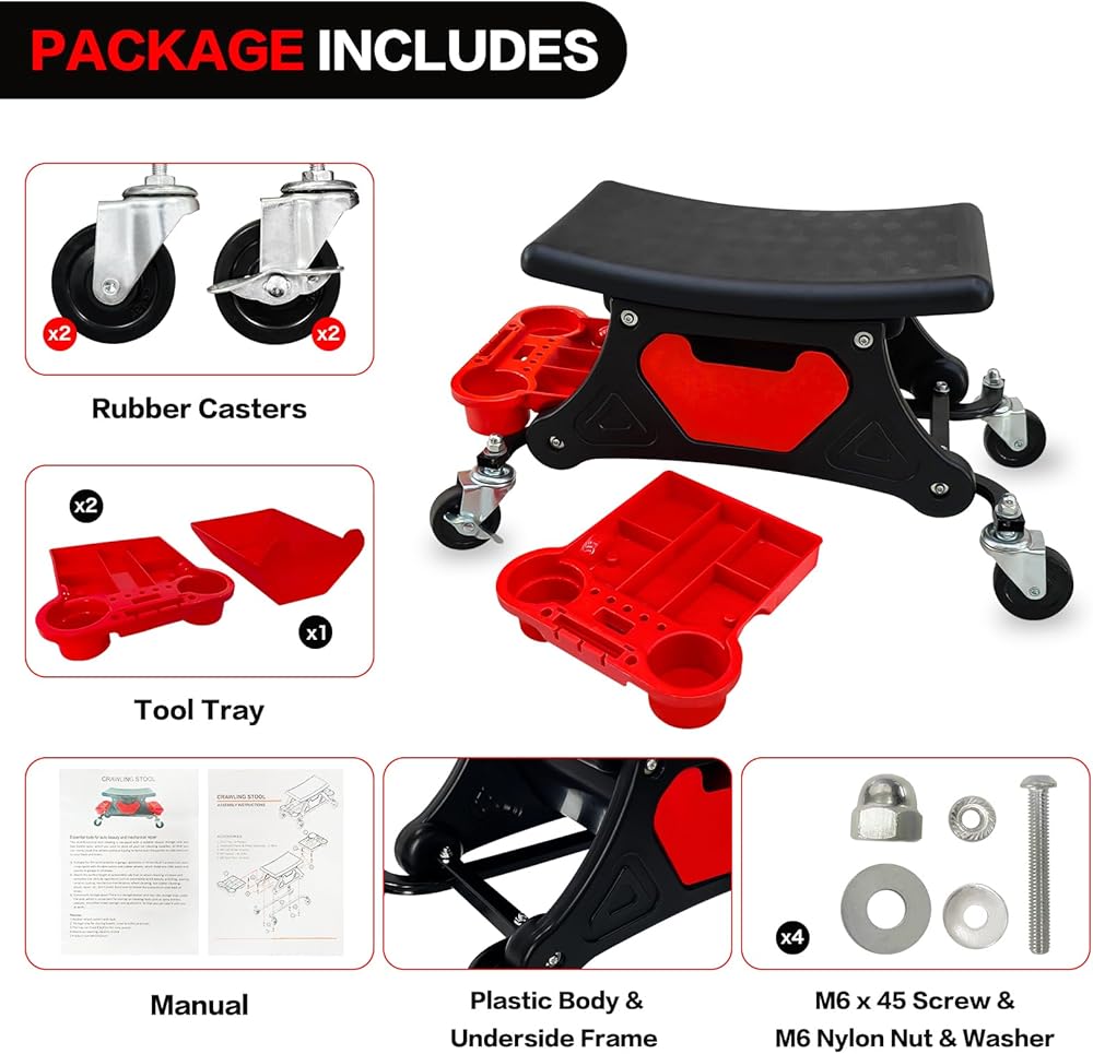 【سعة 300 رطل】: تم تصميم مقعد المقعد الميكانيكي بإطار فولاذي مربع عالي التحمل وجسم بلاستيكي متين لتحقيق الثبات والمتانة طويلة الأمد، ويدعم ما يصل إلى 300 رطل للاستخدام الشاق؛ عندما تجلس عليه وتتدحرج، يمكن للمقعد الزاحف أن يوفر دعمًا كبيرًا لك ولجميع أدواتك الأساسية.