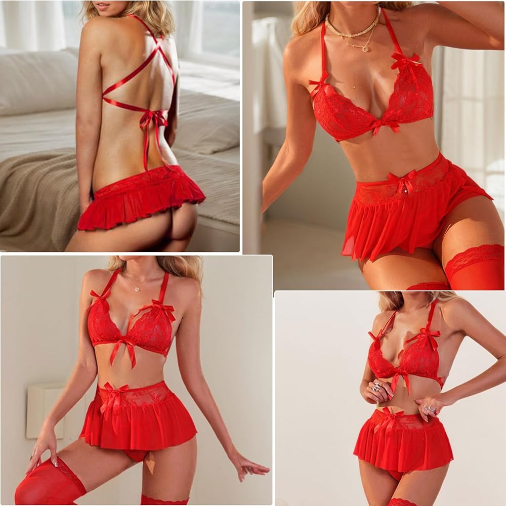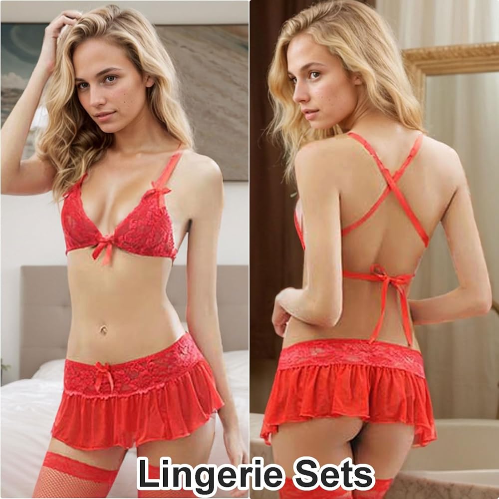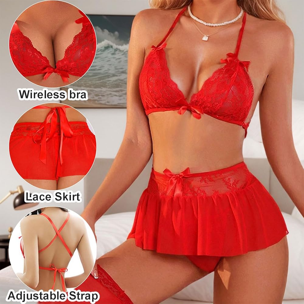 This sexy lace lingerie set is designed to enhance your feminine allure and ignite passion in your love life. The set includes a bra, panties, and a high-waisted lace mini skirt, all in a captivating red color.