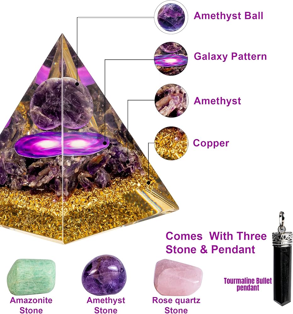 Amethyst Orgone Pyramid - Handcrafted with authentic crystals and high-quality materials, this Orgone Pyramid measures 2.36 x 2.36 inches and radiates positivity. Perfect as a healing gift or a decorative piece, it beautifies any space—your desk, living room, bedroom, or office while filling it with harmonious positive energy crystals.