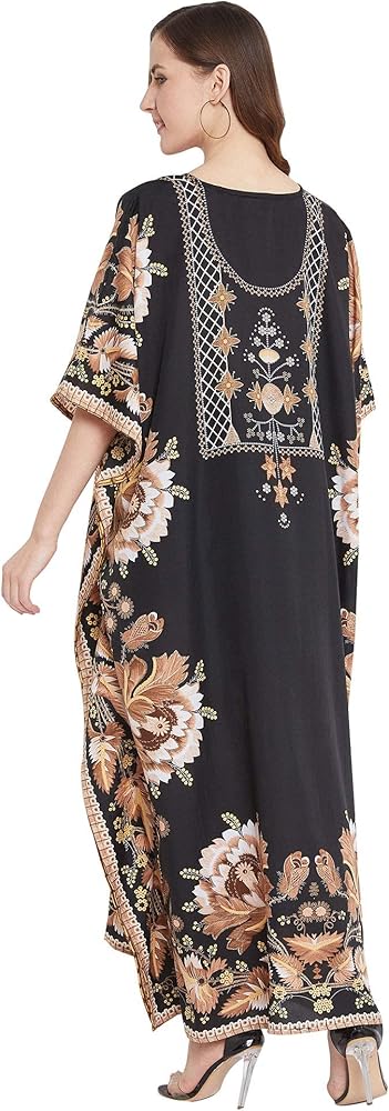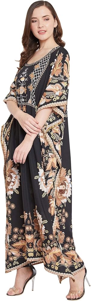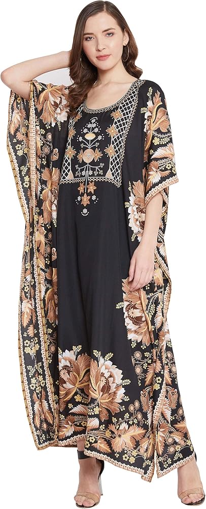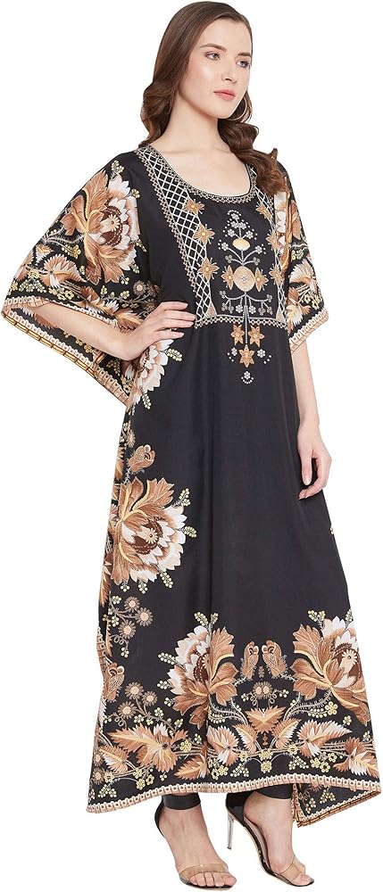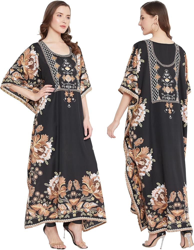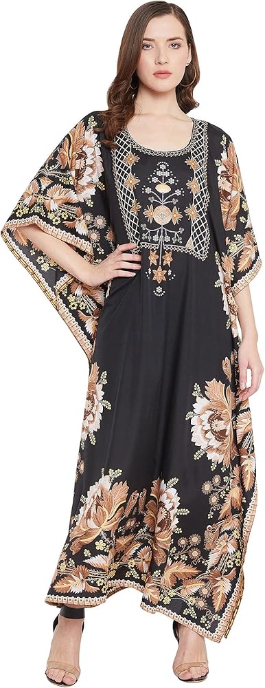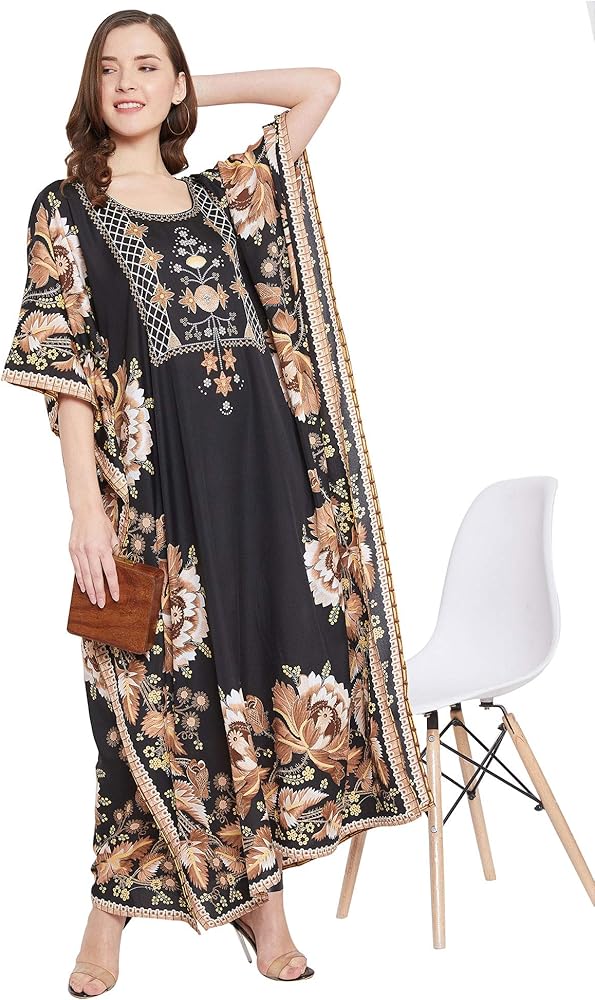 Our kaftan for women is made in high quality polyester fabric that feels luxurious and is ideal for casual as well as everyday wear. The lightweight polyester fabric is breathable and comfortable, making it an ideal choice for summer wear. It moves with your body for added comfort, whether you're lounging at home or attending a special event. This kaftan dress for women is high in style and low in price. Long printed kaftans are versatile and stylish wear for a beach day or a casual hangout. The casual caftan dress with intricate pattern gives a sophisticated finish along with 3/4 kimono sleeves with styled border design. Available in plus size kaftans are your way to a stylish wardrobe for your special occasions. Kaftan dress is the perfect wear for your daily wear as well as party wear. The timeless print on the kaftan is perfect party-wear to make you shine in glam. Wrinkle-Free Fabric: Forget about ironing! This kaftan is crafted with a special wrinkle-resistant fabric, ensuring it stays smooth and fresh-looking even after long wear or packing. Shrink-Free: Made from durable, high-performance polyester, this kaftan is designed to retain its size and shape after washing, so you never have to worry about it shrinking. A slight variation may occur in colors and size specifications. Colors may appear slightly different via website due to computer picture resolution and monitor settings.